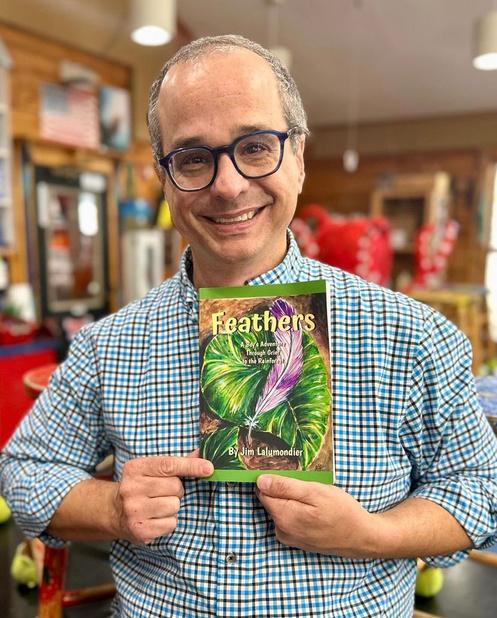 His book is entitled Feathers: A Boy’s Adventure through Grief to the Rainforest. Mr. Lalumondier went into detail about his book, meant for readers ages 10 to 14, telling me that “it is about a child whose father has passed away, and while going through that, he discovers a rare Amazonian bird living in his stomach ” However, Mr Lalumondier relays a larger message, saying that “the process of getting that bird back to the Amazon is a metaphor for his grieving process ”