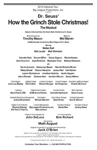 Based on the production produced by The Old Globe, San Diego California Louis G. Spisto, Executive Director Originally commissioned by and produced at The Children’s Theatre Company, Minneapolis, Minnesota Produced by permission of Dr. Seuss Enterprises, L.P.