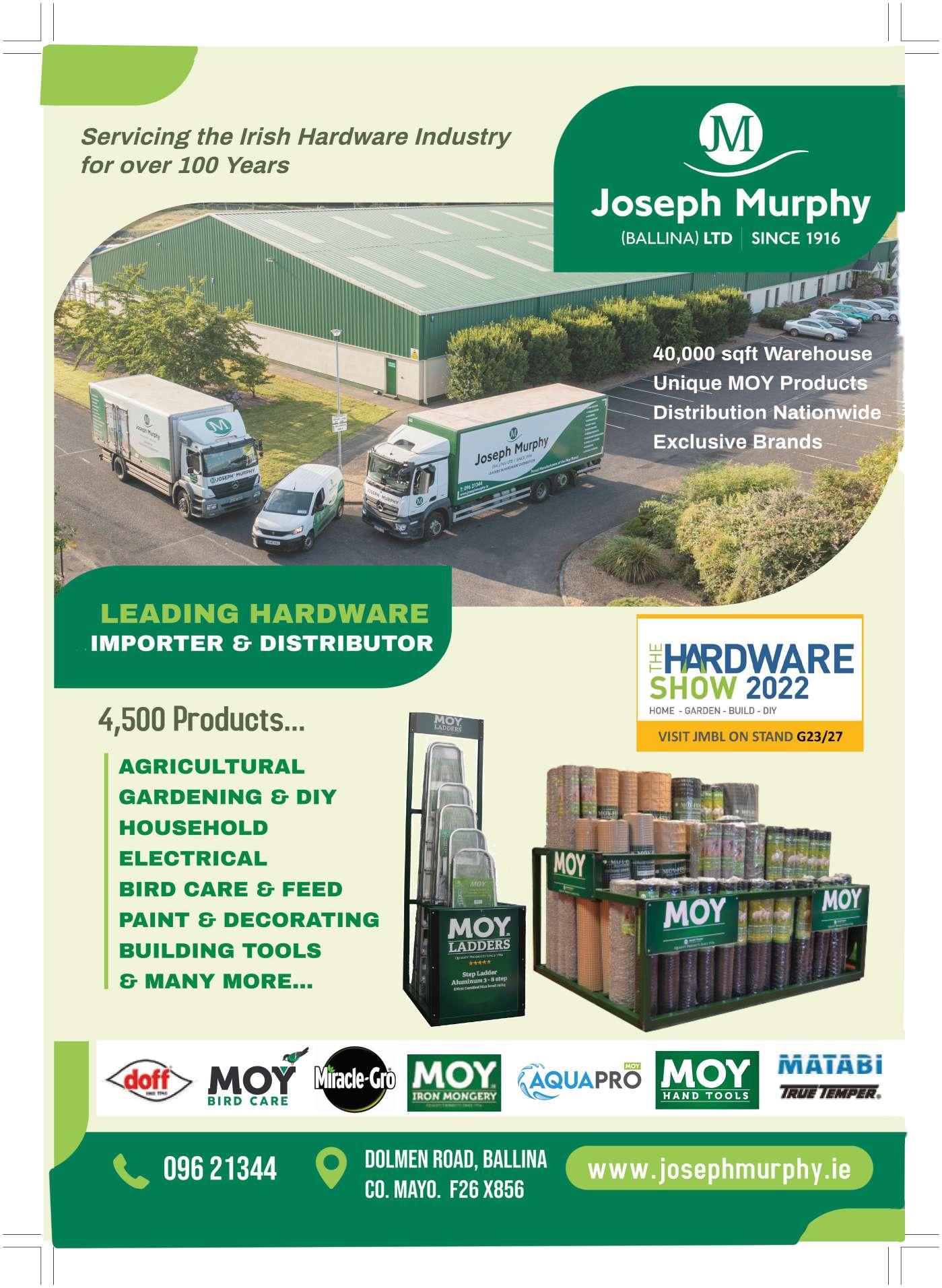 There have been some amazing successes of late for the Ballina based distributor Joseph Murphy Ballina Ltd (JMBL) and 2022 is proving to be no different. The management team at JMBL have recently been awarded with the All-Ireland Business Foundation (AIBF) All-Star Accreditation and this month they announce, their MD Lorraine Burnell has been awarded All-Star Mayo Business Person Of The Year 2022. AIBF CEO Elaine Carroll: “Lorraine has shown herself to be a dynamic and talented leader with a bright vision for the future of JMBL. Her vast experience and notable talent allows her to execute on that vision and we are proud to recognise her with All-Star Mayo Business Person Of The Year 2022 Accreditation.” The Hardware Journal recently spoke to Lorraine about her plans for the future of the thriving business: “I am very excited about the future of the business and I am proud of my Management Team and the continued development of our products and services to our growing customer base. I always say, I am nothing without my team and as a team we are striving to completely restructure and streamline the business. Receiving these awards and accreditations recognises the work and progress driven by the team. For over 100 years JMBL have been a strong player in the market and we want to look to the future by harnessing the new processes and systems we have developed over the past year. We have a new SAP system, a new e-Commerce website josephmurphy.ie with over 4,500+ products online and a new EDI system.” JMBL will be exhibiting this year, for the first time, at The Hardware Show. They will have a fantastic display of their MOY Ranges which includes Ironmongery, Tools, Wheelbarrows, Gardening ranges and more! There will also be more announcements of their new Winter Ranges to include, wicker baskets, heaters and clothes airers. The business offers a diverse range of own branded MOY products as well as leading industry brands. “We are continually diversifying our services and have developed our Distribution, CDC and Pick & Pack Services. We can also announce we have secured exclusive new brand agencies for the UK & Irish markets. We are all in a new economy and we will have to diversify and be flexible to adapt. I am so excited for the next chapter of JMBL”, states Lorraine.