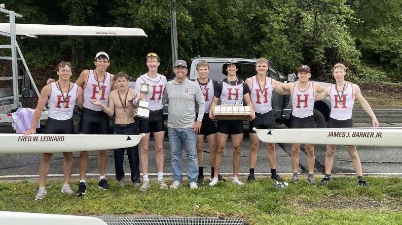 Members of the Varsity Quad and Varsity Four celebrate victories at the City Championships on May 5, 2024