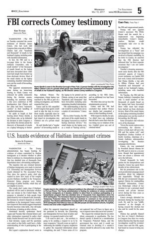 Comey Fired, From Page 1 the FBI and congressional panels. Trump will now appoint Comey’s successor. The White House said the search for a replacement was beginning immediately. Comey’s deputy, Andrew McCabe, would presumably take over in the interim. Trump has ridiculed the investigations as a “hoax” and has denied that his campaign was involved in Russia’s meddling. In his letter to Comey, he asserted that the FBI director had informed him “on three separate occasions that I am not under investigation.” Tuesday’s stunning announcement came shortly after the FBI corrected aspects of Comey’s sworn testimony on Capitol Hill last week. Comey told lawmakers that Huma Abedin, a top aide to Hillary Clinton, had sent “hundreds and thousands” of emails to her husband’s laptop, including some with classified information. On Tuesday, the FBI told the Senate Judiciary Committee that only “a small number” of the thousands of emails found on the laptop had been forwarded there while most had simply been backed up from electronic devices. Most of the email chains on the laptop containing classified information were not the result of forwarding, the FBI said. Some lawmakers did welcome news of the dismissal. “Given the recent controversies surrounding the director, I believe a fresh start will serve the FBI and the nation well,” said Republican Lindsay Graham of South Carolina, chairman of a Senate Judiciary subcommittee investigating the Russian campaign interference. Comey, 56, was nominated by President Barack Obama for the FBI post in 2013 to a 10-year term, though that appointment does not ensure a director will serve the full term. Praised frequently by both parties for his independence and integrity, Comey has spent three decades in law enforcement. But his prominent role in the 2016 presidential campaign raised questions about his judgment and impartiality. Though the FBI did not recommend charges against Clinton for mishandling classified information, Comey was blisteringly critical of her decision to use a personal email account and private internet server during her four years as secretary of state. Comey strongly defended his decisions during the hearing last week. He said he was “mildly nauseous” at the thought of having swayed the election but also said he would do the same again. Clinton has partially blamed her loss on Comey’s disclosure to Congress less than two weeks before Election Day that the email investigation would be revisited. Comey later said the FBI, again, had found no reason to bring any charges.