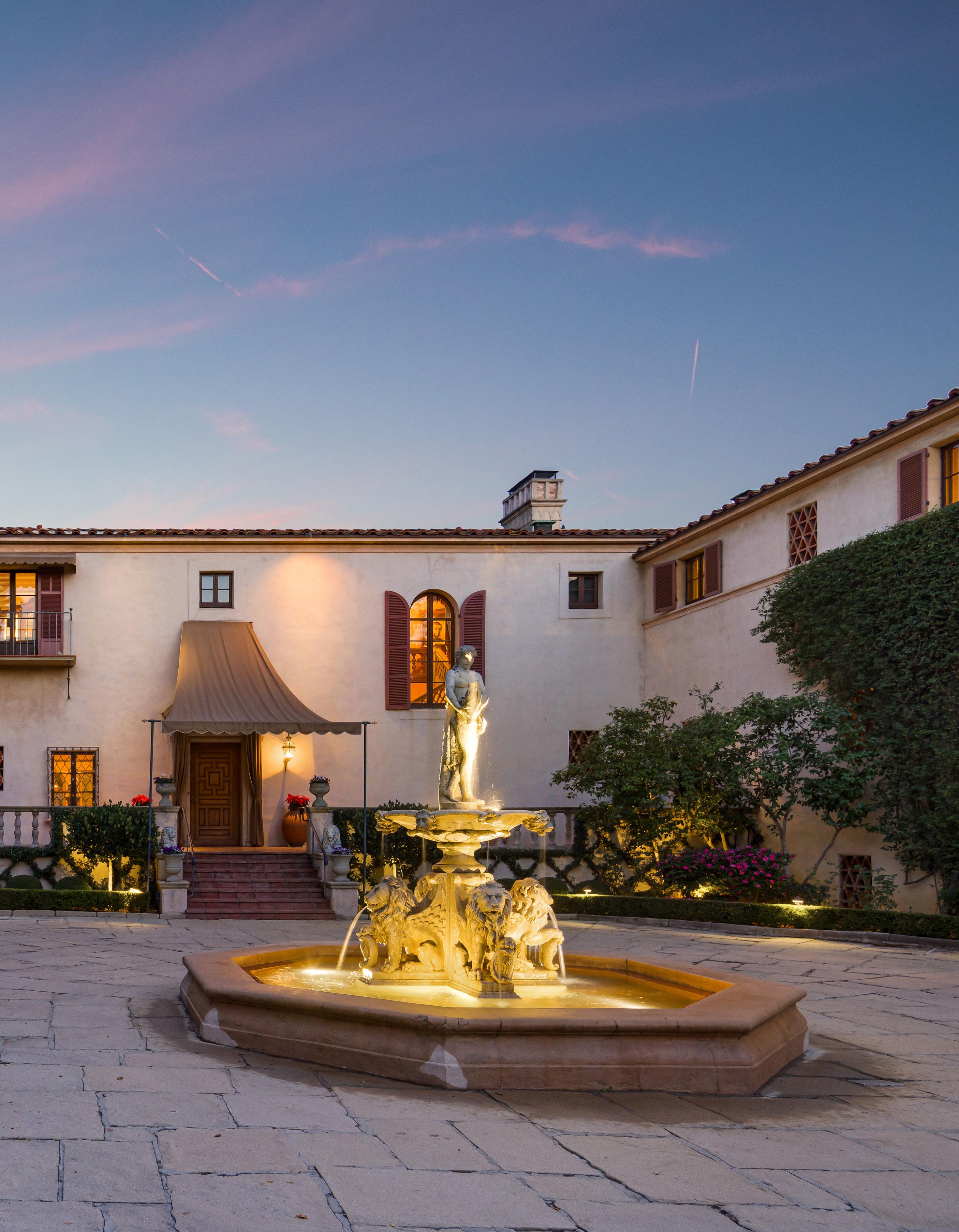 Beyond the fireside living room, fire-engine red cabinetry highlights the modern appliances in the chef’s kitchen. A steel-top island anchors the space that includes a casual seating area and direct access to the Zen-like courtyard. Sun-kissed trees loom over the serene outdoor room that also has a birdbath and room for sculptural artworks. The primary suite with its Brutalist-inspired bathroom is another spot with direct access to the courtyard.
