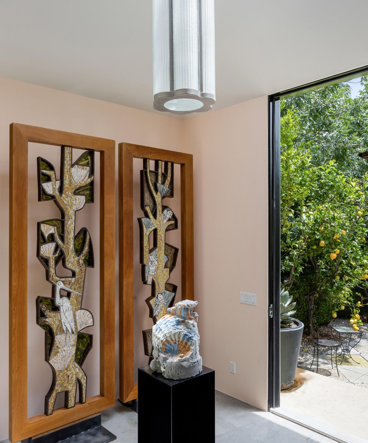 Bordering 280 acres of protected parkland, the secluded Paige Street residence was designed and built by an artist and architect in 2004. Lush landscaping by Mark Rios creates a buffer between neighbors at the end of a private driveway where the abode’s boxy structure is accented by rolling hills and views of the San Gabriel Mountains.