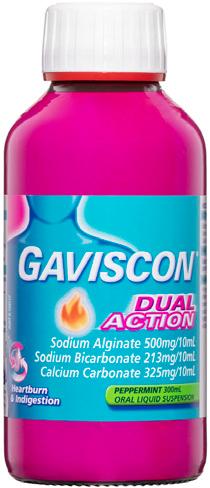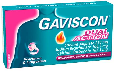 Active Ingredients: Sodium alginate 500mg, sodium bicarbonate 267mg, calcium carbonate 160mg.