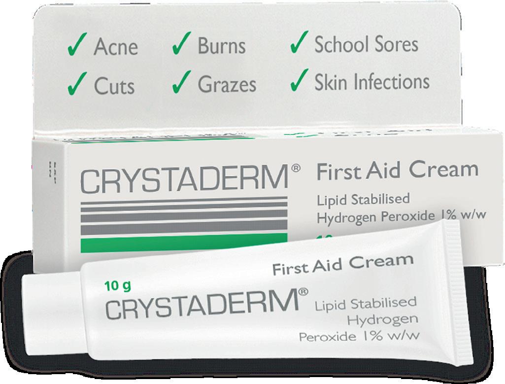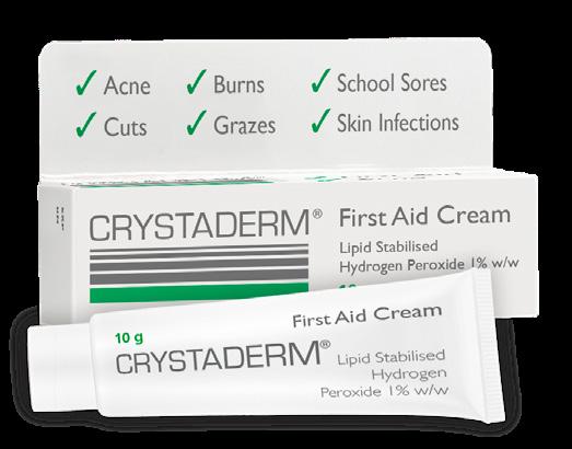 C., Topical Antimicrobial Therapy for Treating Chronic Wounds, 2009, 49:1541-1549. Crystaderm® First Aid Cream (Hydrogen Peroxide 1% w/w, 10g) is for the treatment and prevention of minor skin infections such as acne, cuts, scrapes, burns or school sores. Please refer to the Product Packaging for information on precautions, Contra-indications, Adverse events, Interactions and Dosage. AFT Pharmaceuticals, Auckland. TAPS PP8881.