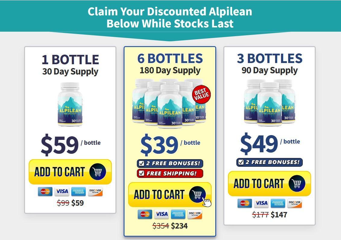 The cost of one bottle ofAlpilean is $59. If you want to buy three bottles ofAlpilean capsules, then you pay $147.The makers ofAlpilean suggest that you buy three or six bottles ofAlpilean capsules to get maximum health benefits.