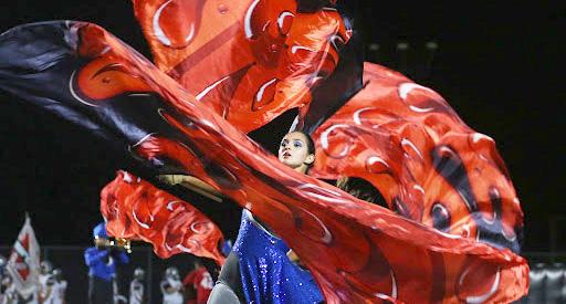 Junior colorguard dancer Isabella Wilson performs during the band’s half time show. The color guard used its flags from last year’s show, “Penstriped,” for this performance.
