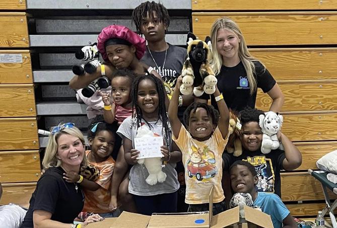 Siblings grin with their new stuffed animals from the Cozy Crates boxes that were delivered to a shelter set up at South Fort Myers High School. Lily said that the family, whom her and her mother got to hand-deliver their boxes to, had nine young kids. PhotoviaLilyFalconer