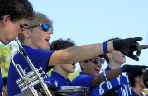 New percussion director Ben Koch coaches the snare drummers for their entrance to the drumline competition on Sept. 17. The contest gives high schools a chance to premiere their show for the first time.