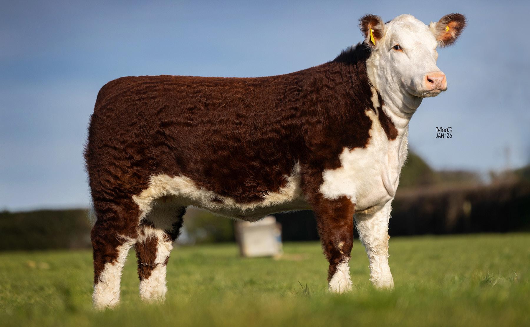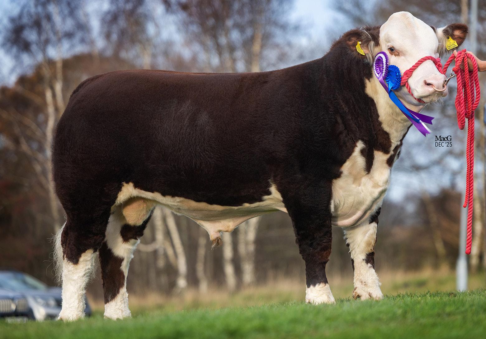 Chuckles is a thickset well-marked, dark-coloured young bull with great locomotion. His temperament is second to none having been successfully shown in 2025 by an 11-year-old, his highlight being placed 1st in his class at the National Poll Show. With a packed pedigree behind him, Chuckles would be well worth a look. Eligible for retest.