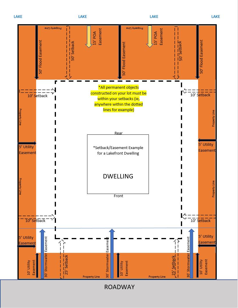 SEE DIAGRAMS ON NEXT TWO PAGES FOR EXAMPLES OF SETBACKS & EASEMENTS ON LAKEFRONT & NON-LAKEFRONT LOTS