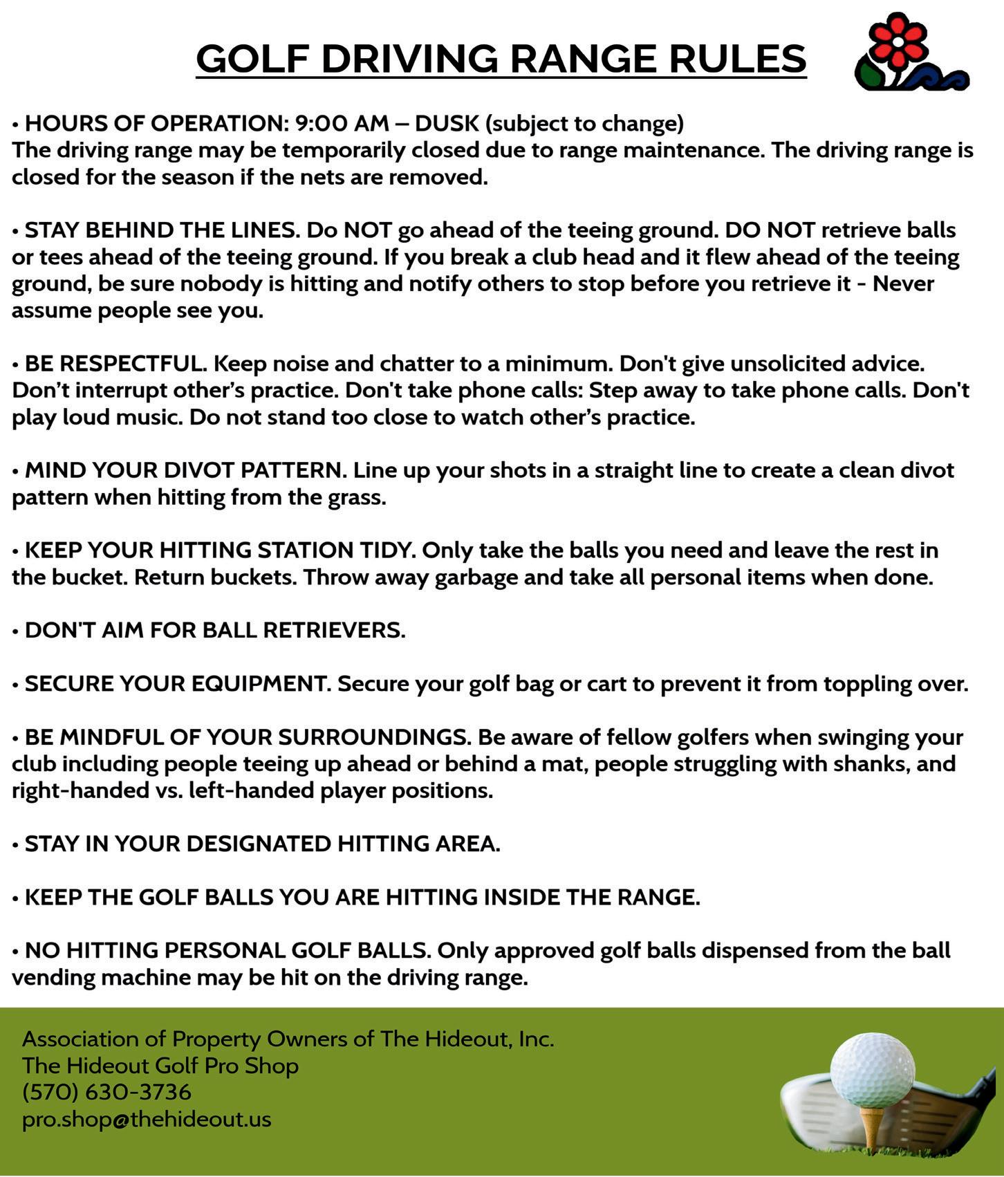 Mike Burns – Golf Pro Shop Manager (570) 698-4100, ext. 183 mburns@thehideout.us