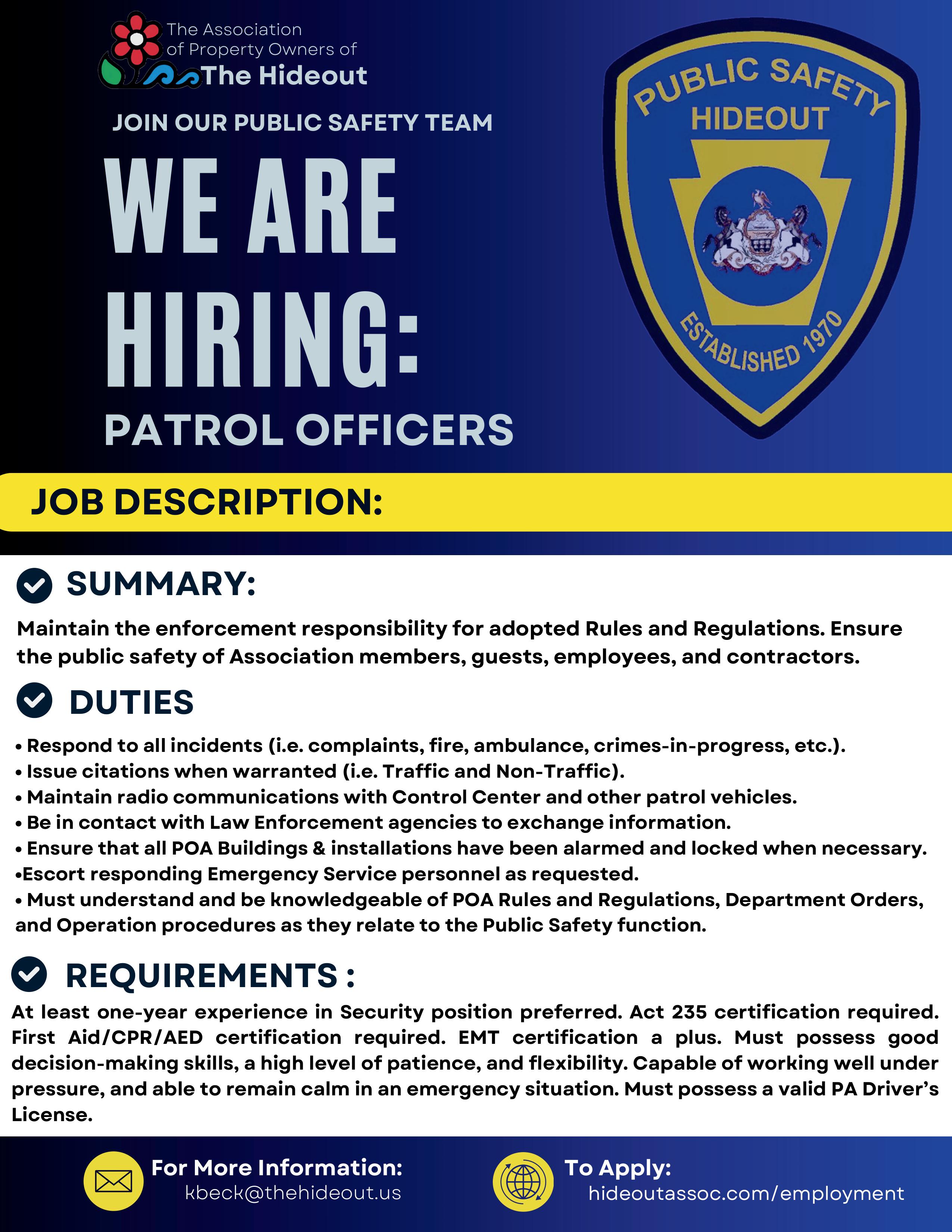 The Board thanks the membership for voting in the recent Board elections. Congratulations to Ed Esposito, Maureen DiGiovanni and Rick Yocum on their election and thanks to Michael Hanbury and Margaret Conlon for stepping up to run for the Board. I want to also thank the Board for choosing me to serve as president along with Robert Trombley as Chair, Lou Delli Santi as Vice President, William Wagner as Secretary, and Rick Yocum as Treasurer at the Annual Meeting held on October 6th. We have much work ahead. The first order of business was to form a Screening Committee to find a new community manager. After six years of dedicated service, Larry Frotten announced his plans to retire. We thank Larry and his wife Andrea for all that they have done for The Hideout. Larry helped guide the community through a worldwide pandemic, while guarding against the effects of high inflation, continuing to update as well as add amenities such as the new tiki bar, the golf driving range, the new north gates, improvements at the Ski Hill and art center – all improvements which will benefit the community for years to come. We have big shoes to fill. Anyone interested in applying can go to www.hideout.com/employment. With fall in the air, our maintenance