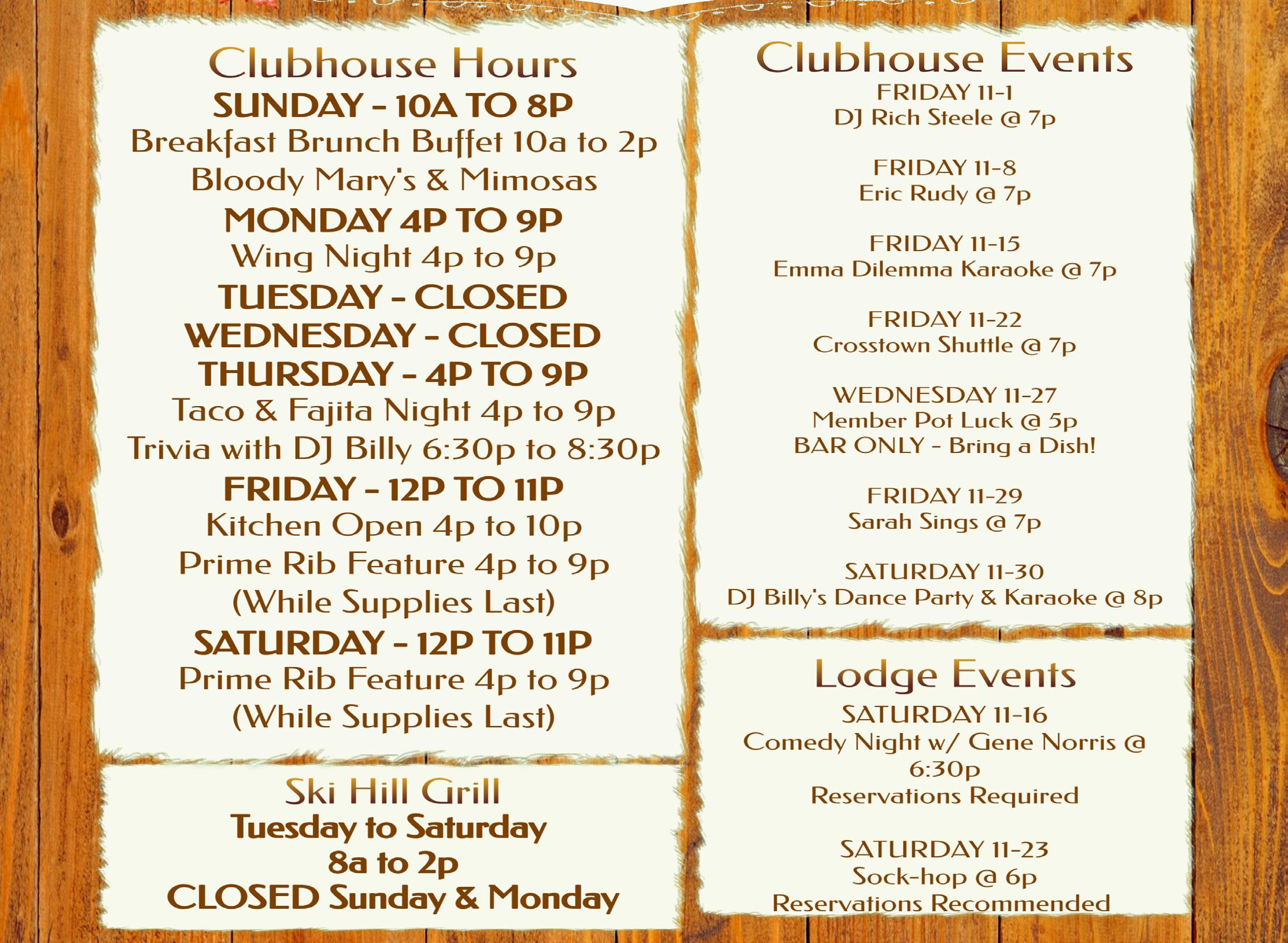 The Food and Beverage Committee has been hard at work with the Food and Beverage team, addressing concerns expressed by some of the membership. Good things are happening at the Clubhouse with the new menu being launched. Sunday Brunch has become a hit, along with Burgers and Brews on Sundays, Wing Night Monday, and Cinco Thursday, as well as the new gastro pub menu and Prime Rib Specials that are now available. And of course, the Ski Hill Grill serves breakfast and lunch, Tuesday through Saturday. Please stop by and give it a try. If something isn’t right, please fill out a comment card and speak to the staff to address your concerns. The Committee is constantly monitoring the cards and addressing issues with management.