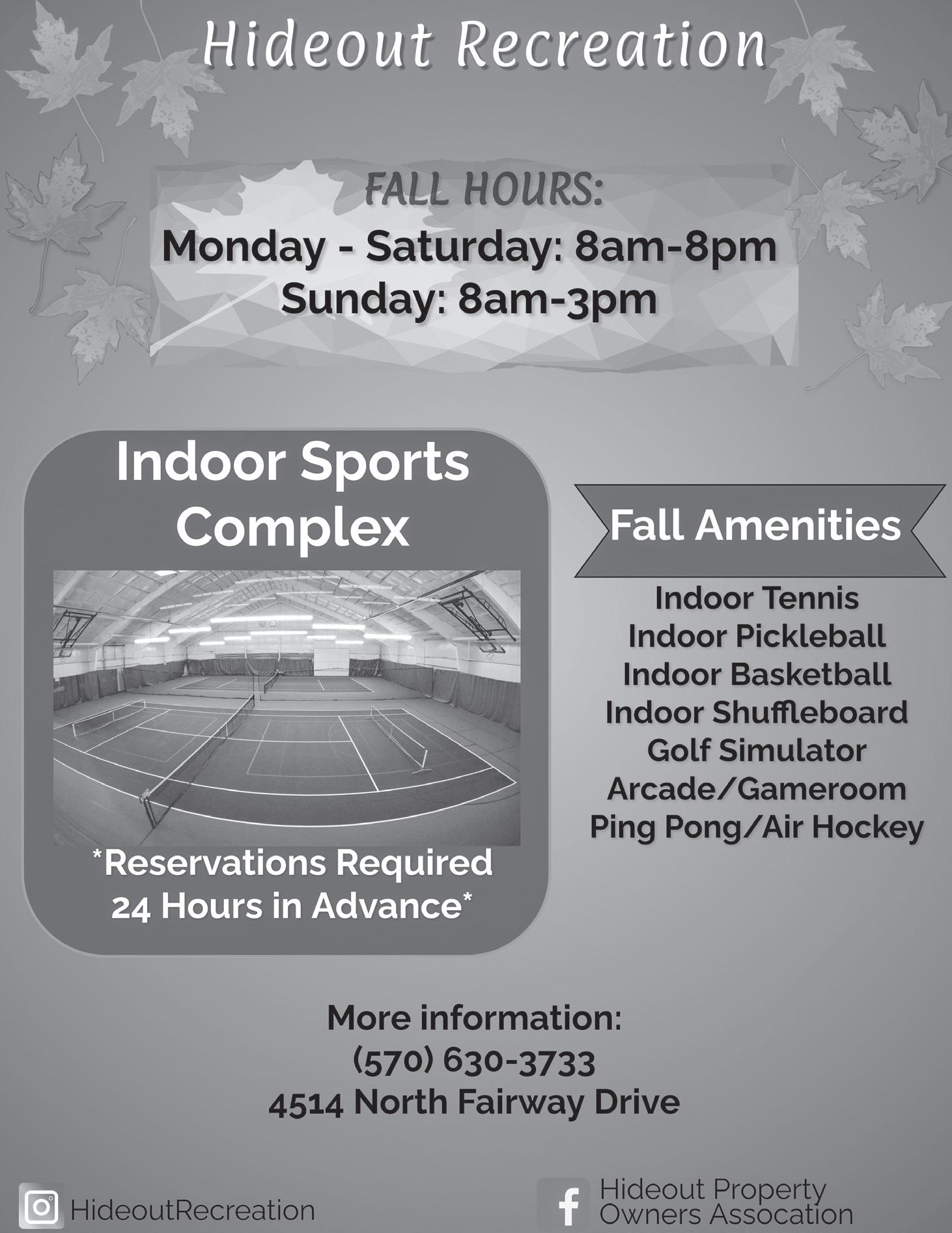 We invite all to enjoy the beauty of the Fall season and hope you will partake in the many amenities and offerings we have here at The Hideout. ■