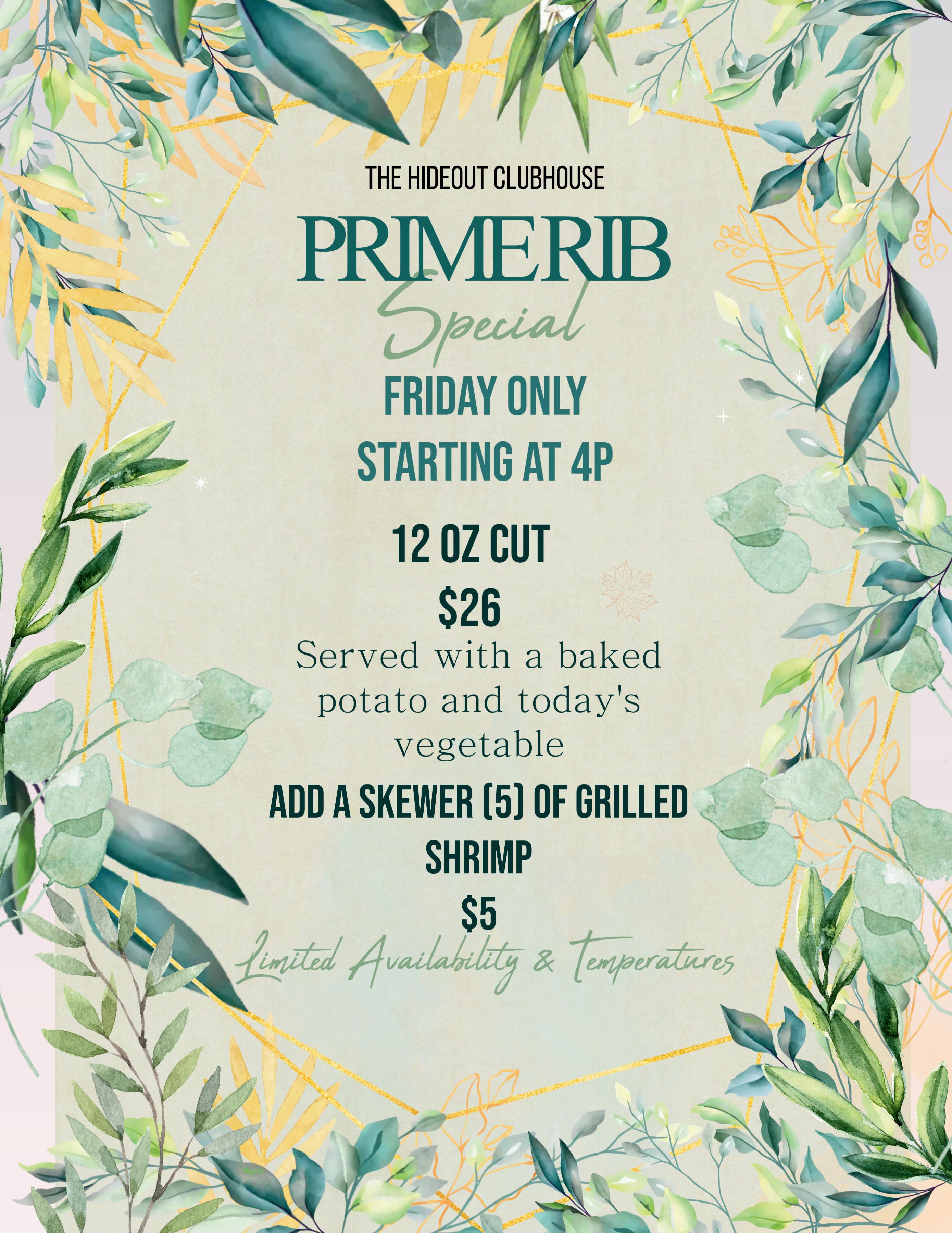 As The Hideout gets into its slower months, Food & Beverage keeps driving in 4th gear. October brings back Friday Prime Rib Nights. On October 3rd, to start off the fall season, we will also be offering Snow Crab for a limited time only. Bistro menu changes have also been made, and soups have started up again, so come experience the newest offerings at the Clubhouse.