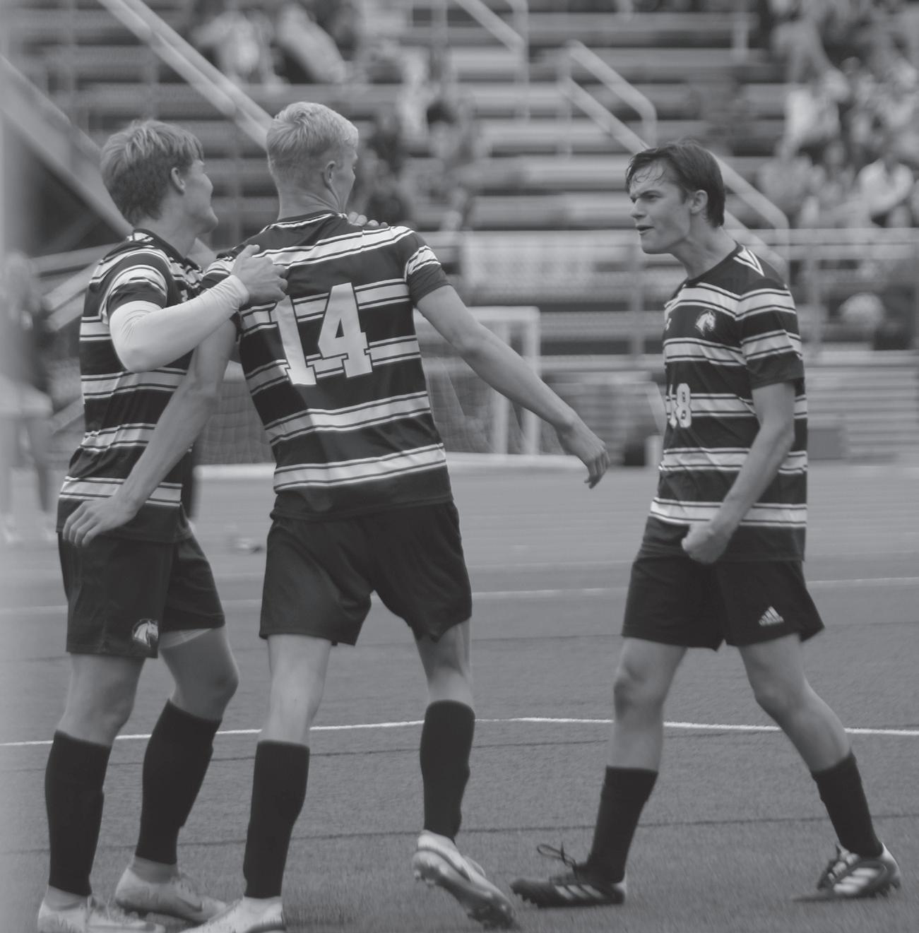 No. 14 sophomore Charlie DeVries and freshman Jeffery Townsend celebrate DeVries’ goal. Courtesy | Cruz Reichert