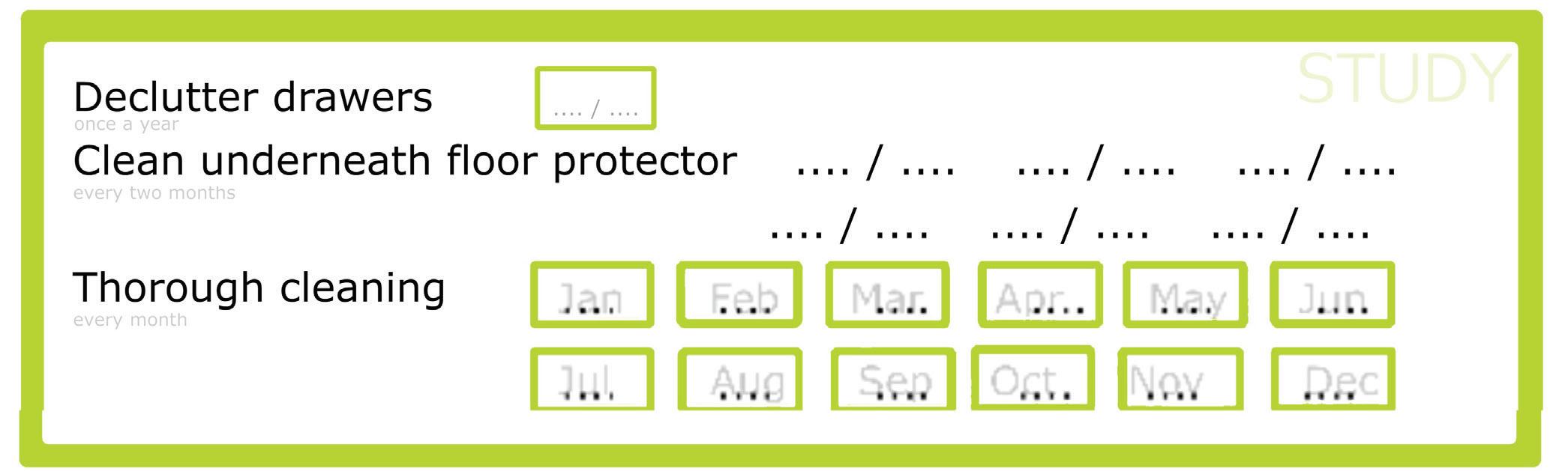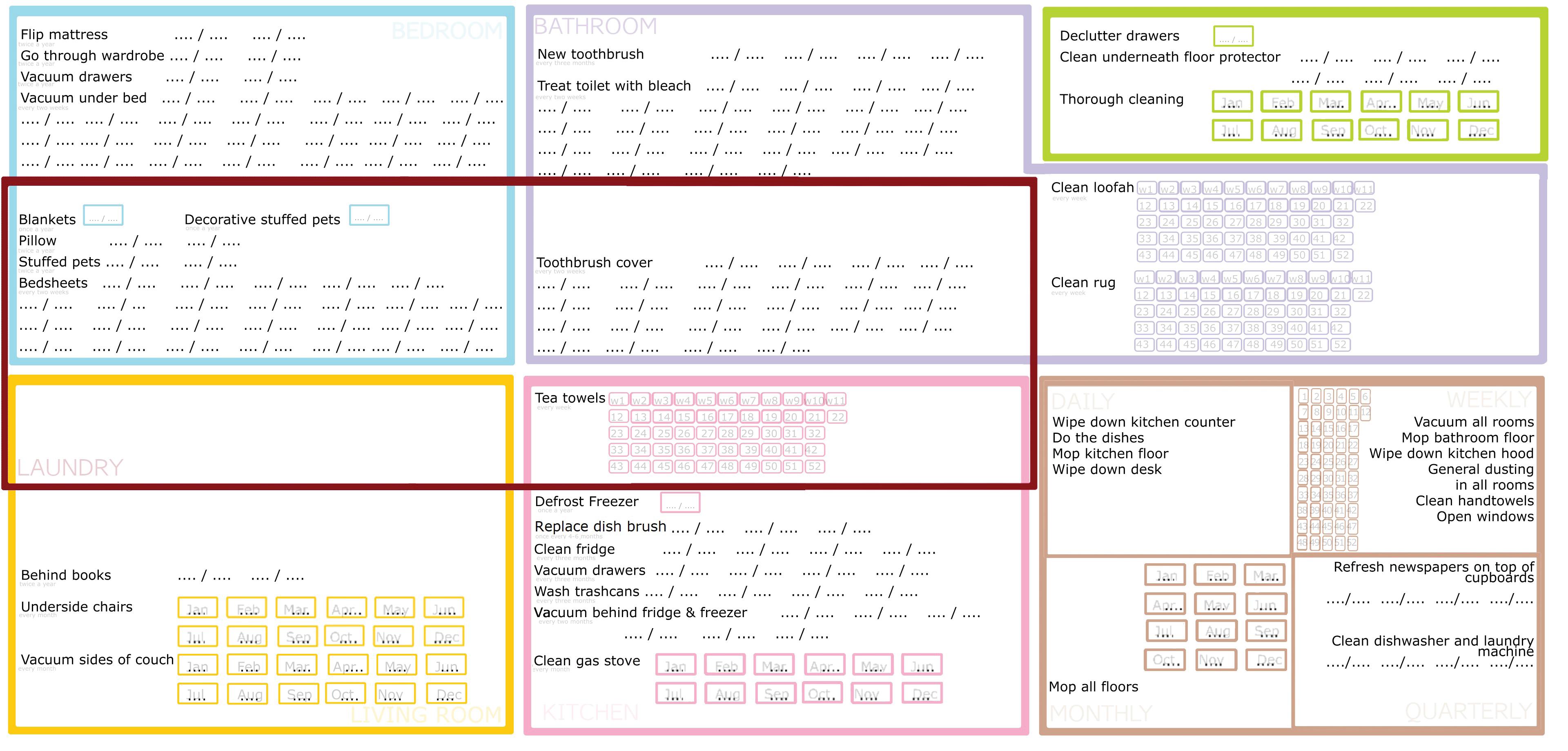 The use of this schedule is simple: print it out, put it somewhere easily accessible but out of sight (on the inside of a cupboard door, for example), and put a pen near it.