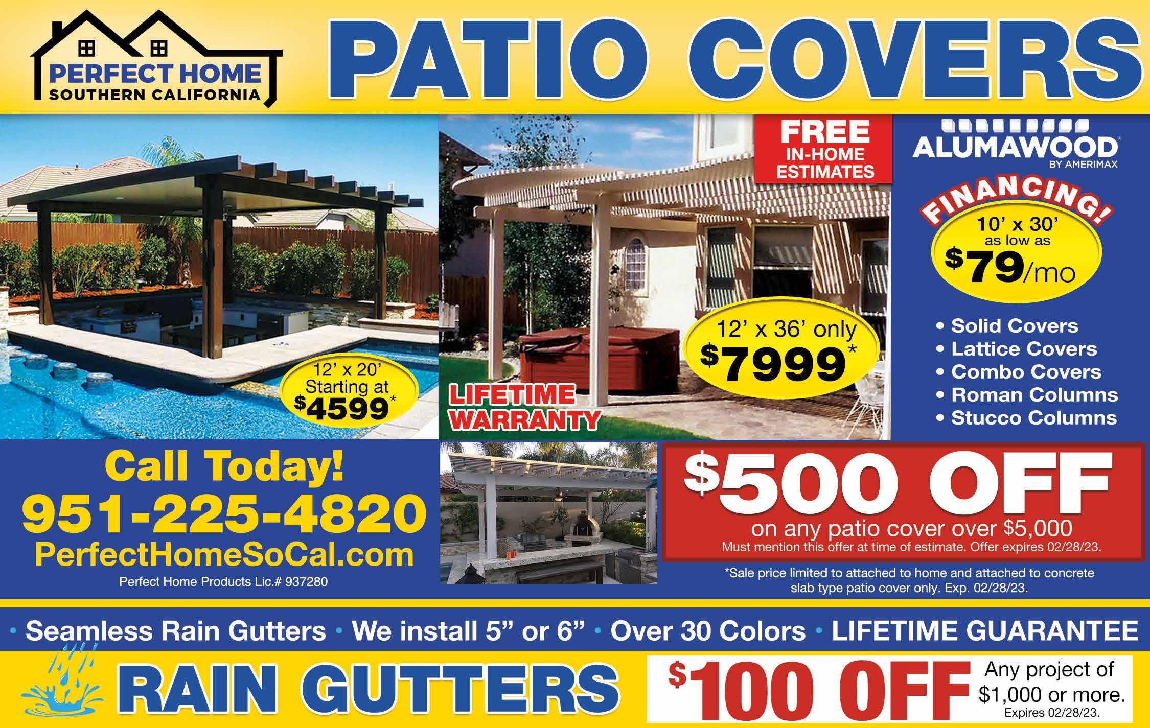 TO ADVERTISE IN THEHOMEMAG, CALL 866-866-4944 | RIVERSIDE COUNTY | 25 Lic# 965972 #BeachCityStairs www.beachcitystairs.com Enjoy Your Custom Staircase Remodel! Remodels New Construction Interior & Exterior Metal & Glass Railings 951-296-6009 EXTERIOR CALL TODAY FREE ESTIMATES CONTEMPORARY MODERN Wood Appearance Without Wood Maintenance License # 615917 Patio Covers & Vinyl Windows Factory Direct | No Salesman 951-379-3777 IT’S TRUE! FREE INSTALLATION Financing Available O.A.C. www.westcoastsidingandtrim.com FREE FAN UPGRADE!