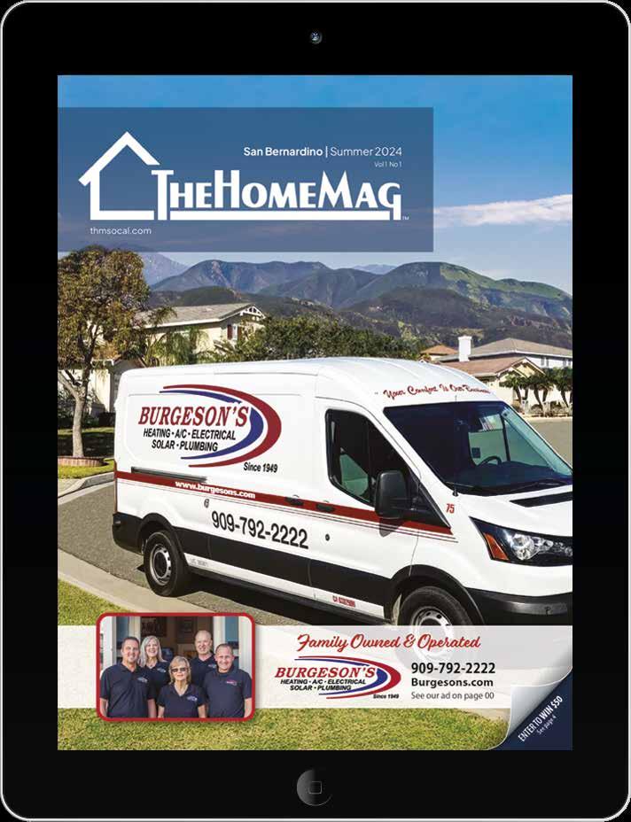 PRSRT STD US POSTAGE PAID LONG BEACH, CA Permit No. 239 www.thmsocal.com Family Owned & Operated • HVAC • ELECTRICAL • PLUMBING • SOLAR + BATTERY • GENERATOR Mention Code: HM Not to be combined with other offers or discounts. Restrictions may apply. Our Burgeson’s Preferred Residential Maintenance Programs are tailored for all your home’s service needs. Individual service plans ensure your equipment is maintained for optimal comfort. Combining them offers optimal savings with even more discounts! Burgeson’s Preferred MEMBERSHIP Your Way Residential Maintenance Programs FOR THE ENTIRE HOME 909-792-2222 burgesons.com MONTHLY SPECIALS SCAN HERE FOR