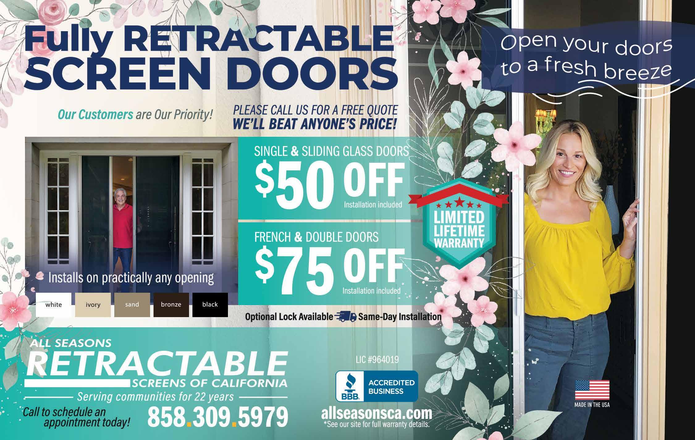 26 | APRIL 2023 | THE HOMEMAG IS AMERICA’S #1 HOME IMPROVEMENT MAGAZINE Watch Our Video at www.casperscreens.com Can Be Installed On: Front-Entry Doors, French Doors, Sliding Patio Doors, In/Out Swing Doors and More Installs on virtually any door opening The Ultimate DISAPPEARING SCREEN DOORS LOWEST PRICES OF THE YEAR!! Allow fresh air in, keep the bugs out! Family-Owned & Operated CLOSED OPEN LIFETIME WARRANTY FREE PHONE QUOTES Buy Factory Direct and Save! With this ad • Tax not included • Offers may not be combined Some restrictions apply • Expires 5-1-23 Installation Included Installation Included any Double Door $ 50 Off any Single Door $ 25 Off 858-768-2168 REFACE • REPLACE • REJOICE CSLB #1041893 FREE SINK with any kitchen reface with new counter tops* More than 25 Years Experience in the Kitchen & Bathroom Industry 7050 Miramar Road, Suite 104 San Diego 92121 Come Visit Our New Showroom! Call Now 760-730-8181 www.EatGatherLove.com *Expires 4/30/23 Financing Available