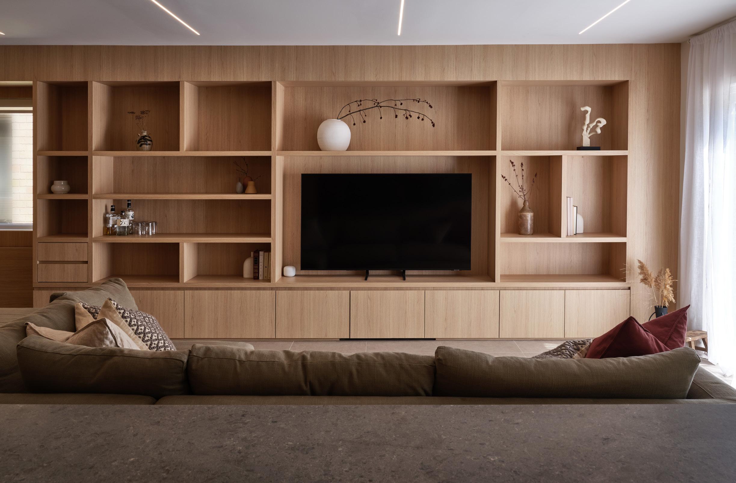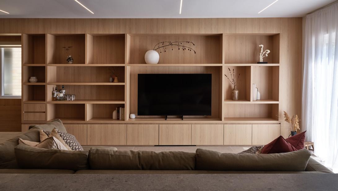 In the living area, a central beam and column are wrapped by wood finishes, with bronze-coloured accent details at the top and bottom. This acts as a sculptural piece that frees most of the original load-bearing walls in the space. The living room and workspace are on one side of the open floor plan and are designed with wooden millwork, which integrates storage, display, and flip-down tables. The kitchen and dining areas wrapped with wood panels are located on the other side. Wooden pocket doors lead to the hidden pantry, a dog shower, and a separate entrance to the garage.