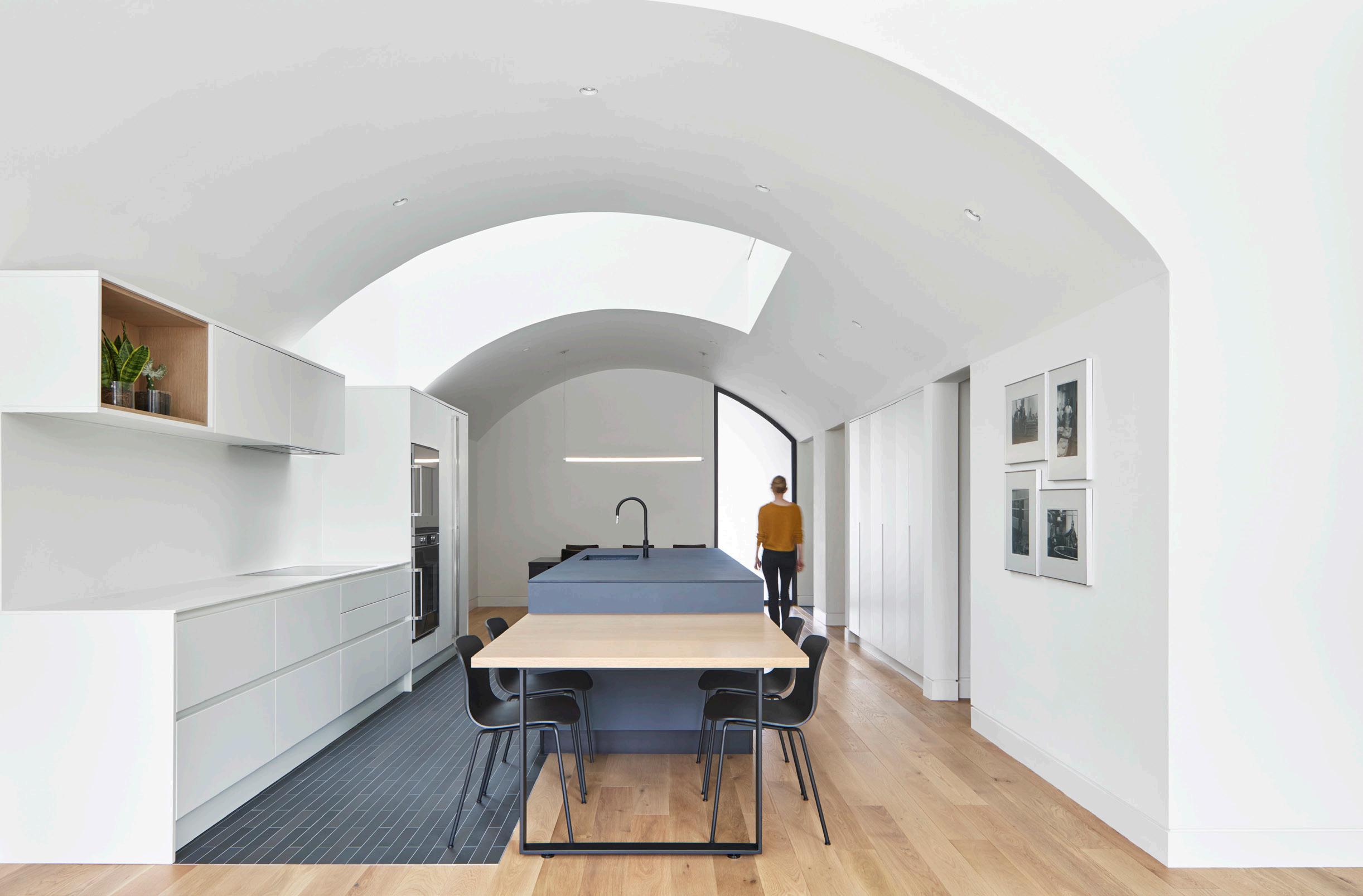 While the barrel vault brings these spaces together, moments of articulation and relief are found through tangential peels and cuts in the vaulted ceiling. The vault remains intact in the dining room, is cut at the length of the kitchen, becomes intact again in the living room, and then unfolds and peels into the backyard. This spatially delineates connected spaces, while also providing natural light to flood into the deep and narrow lot. Situated in the middle of a long floorplan, the kitchen opens and is flooded with natural light from a skylight above.