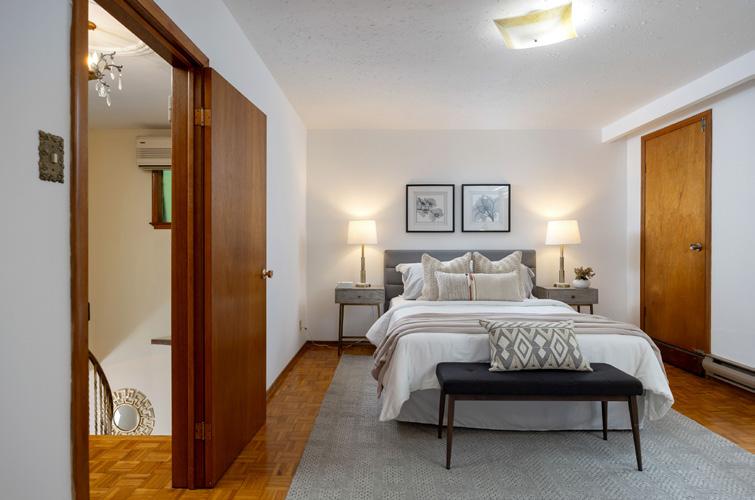 All four bedrooms on the second level are spacious and bright, with windows on multiple sides. The divine primary bedroom retreat includes three cedar lined closets (one walk-in), a 4-piece ensuite, gas fireplace, recessed ceiling, two sets of French doors with Juliette balconies, and a walkout to the south-facing upper level deck.