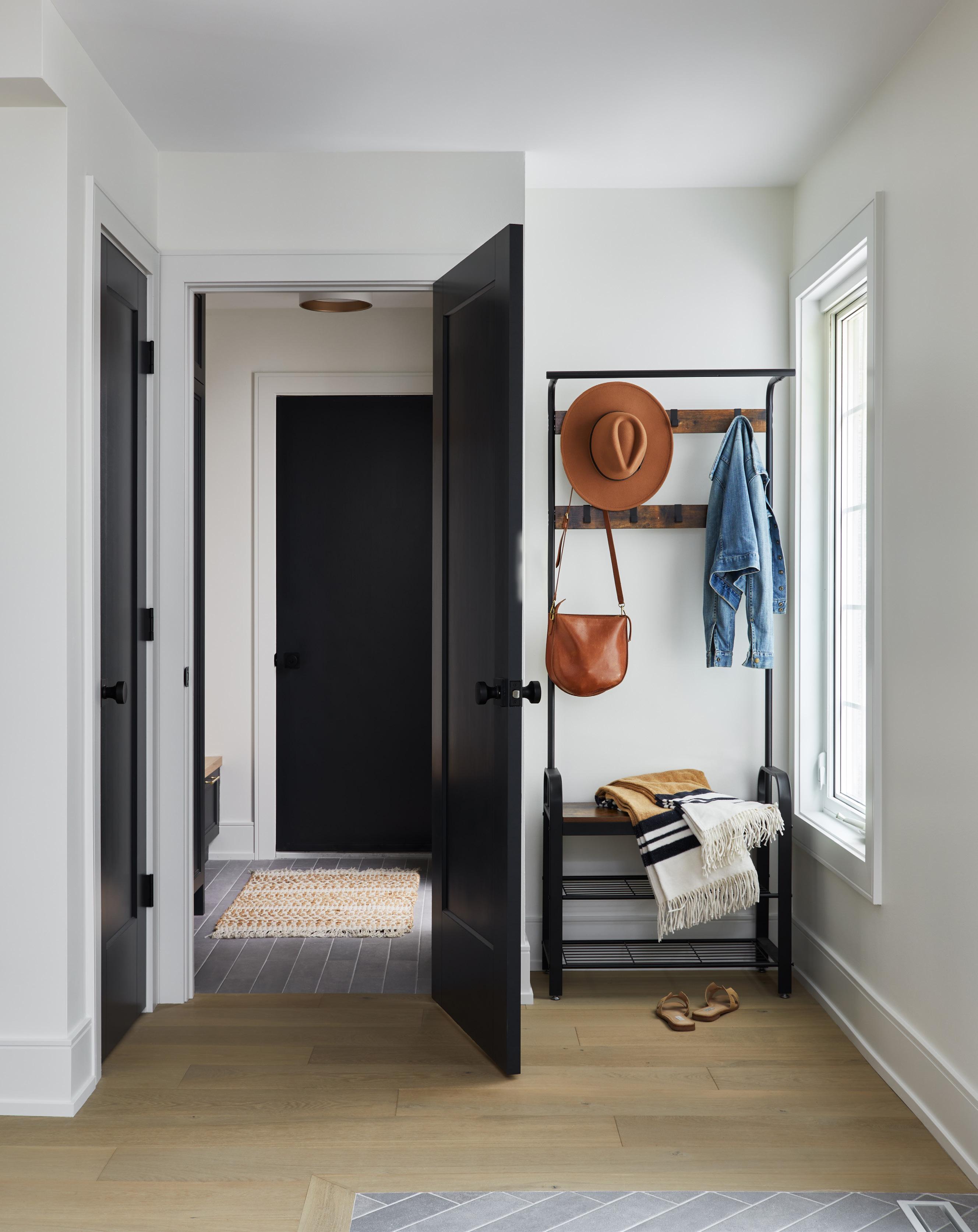 We highly recommend investing in custom storage to address your functional needs, while also adding a custom colour/texture. However, if a custom solution is not in your budget, opt for a bench with wall hooks and then add in colour on the walls or a washable patterned floor runner.