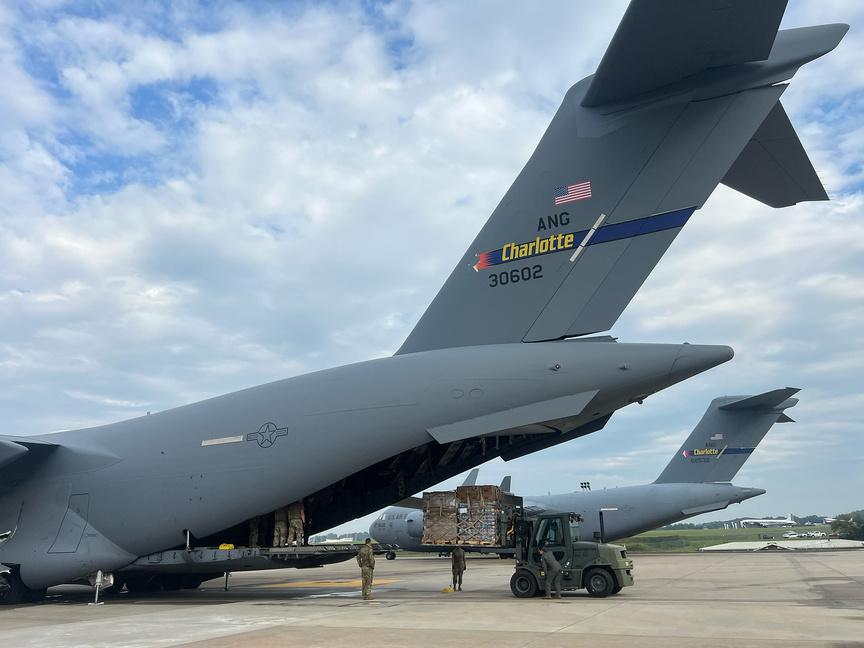 The Federal Emergency Management Agency coordinated with the NCANG to drop off food, water, and supplies to be loaded onto a C-17 Globemaster III to be distributed throughout Western Carolina assisting those impacted by Tropical Strom Helene.