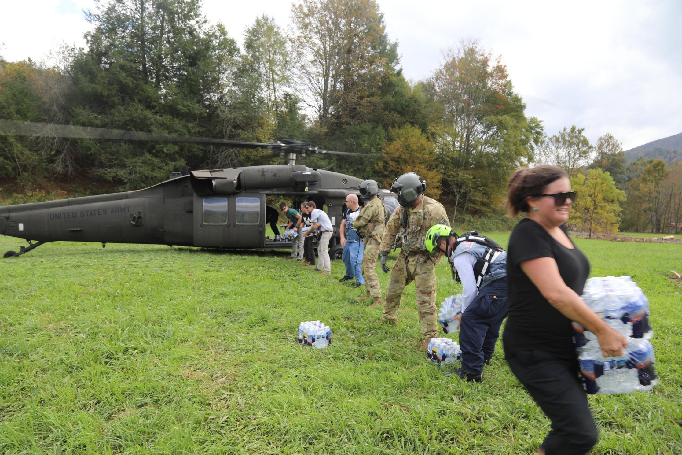 Volunteers and soldiers assigned to Joint Task Force-North Carolina form a line to offload cases of water from a UH-60 Blackhawk to help affected citizens on Oct 3, 2024.. National Guard aviation crews from 17 Army and Air National Guard states, Federal response agencies, Emergency Management and active duty compose Joint Task Force-North Carolina to support citizens affected by Hurricane Helene.