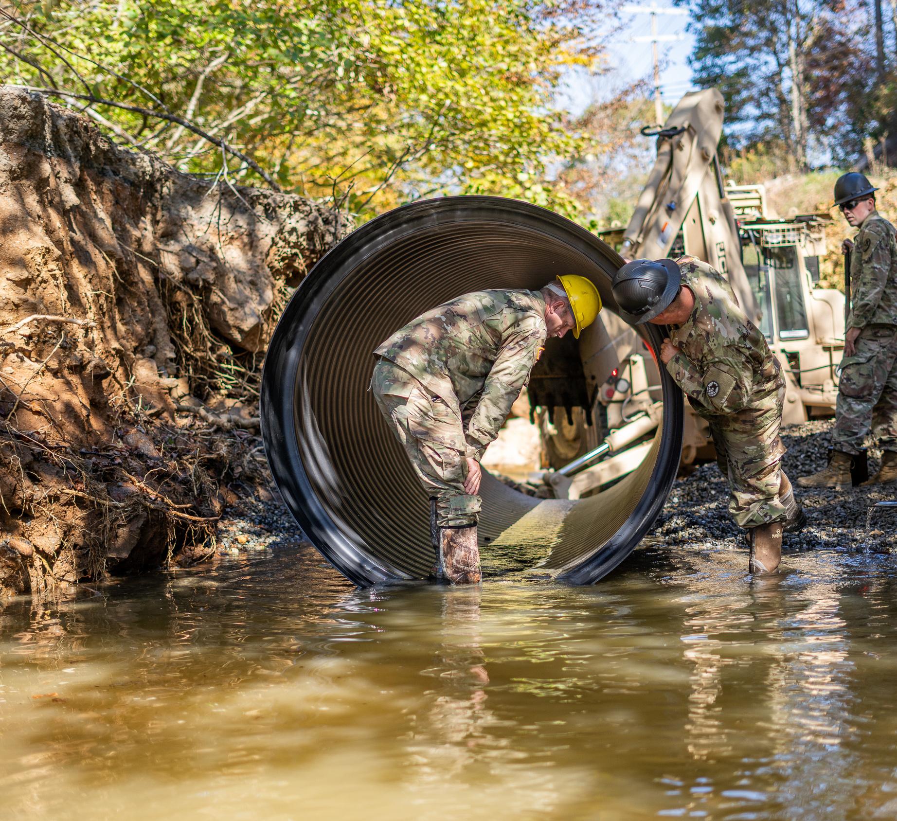 North Carolina National Guardsmen, assigned to the 130th Maneuver Enhancement Brigade, used culverts to restore roadways for local residents in Burnsville, N.C., Oct. 19th, 2024. Joint Task Force-North Carolina deployed military capabilities in support of Tropical Storm Helene relief efforts. U.S. Army National Guard photo by Staff Sgt. Hannah Tarkelly