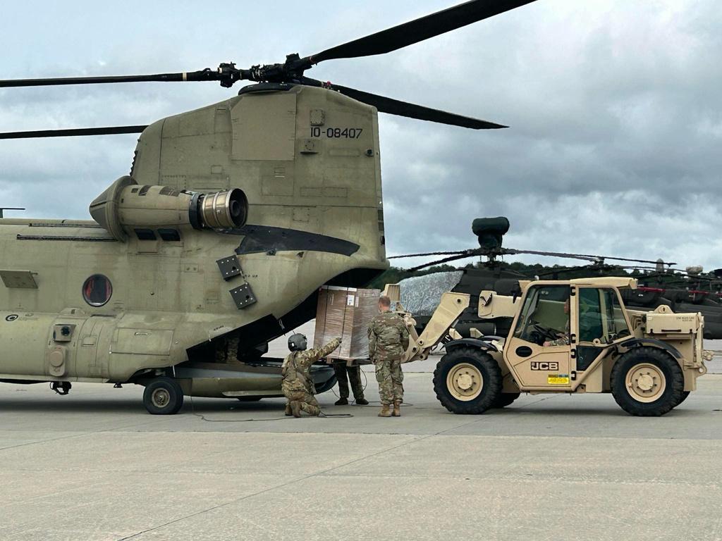 Will Wilson assigned to the North Carolina Urban Search and Rescue Task Force 11 loads pallets of water onto a CH-47F Chinook piloted by soldiers assigned to the Bravo Company, 2nd Battalion, 104th Aviation Regiment from the Connecticut Army National Guard working with the 2-130 Airfield Operations Battalion from the North Carolina National Guard Armory located in Salisbury, NC on Sept 27, 2024. National Guard Aviation crews from Connecticut, Maryland, Pennsylvania and Iowa are supporting the NC Emergency Management and the NC National Guard in response to citizens affected by Hurricane Helene.