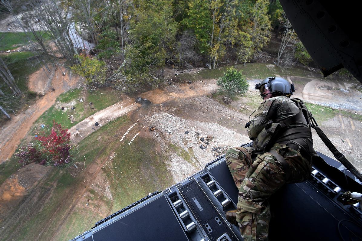An aircrew member with the Minnesota Army National Guard leans out the crew door of a CH-47 Chinook helicopter to keep watch for obstacles as his crew taxis to take off in Salisbury, North Carolina, to drop off food, water, and other supplies in the aftermath of Hurricane Helene, Oct. 7, 2024. National Guard units from 18 states have responded to areas impacted by the storm and have been taking part in food and water distribution, search and rescue, debris clearance and other tasks as needed.