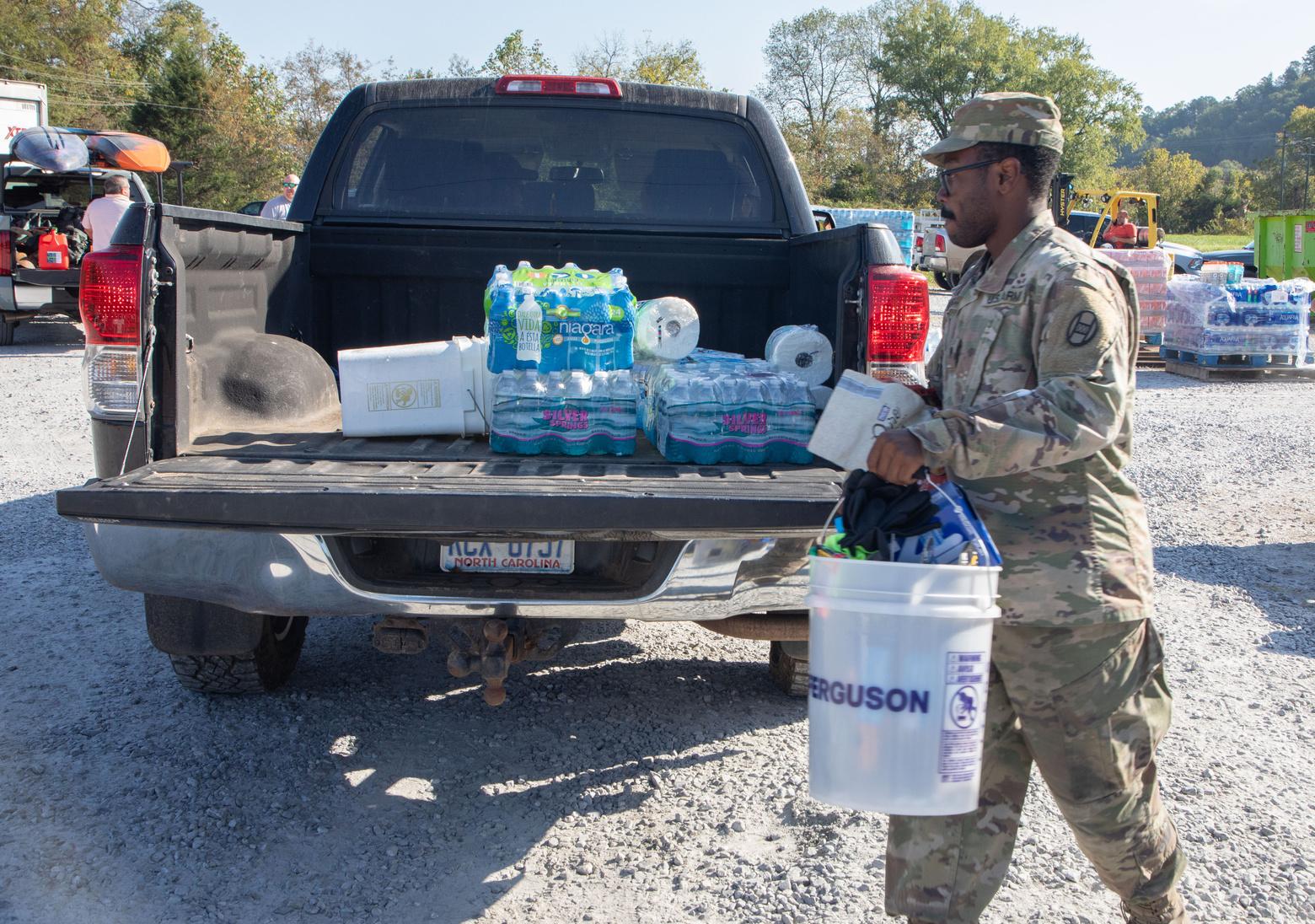 OLD FORT, North Carolina - Spc. Talib Brooks’ day looks a little different than usual. He has been working at a donation distribution center in Old Fort, North Carolina, handing out food, water, cleaning supplies, and much more to residents of Old Fort and surrounding areas as part of Joint Task Force- North Carolina.
