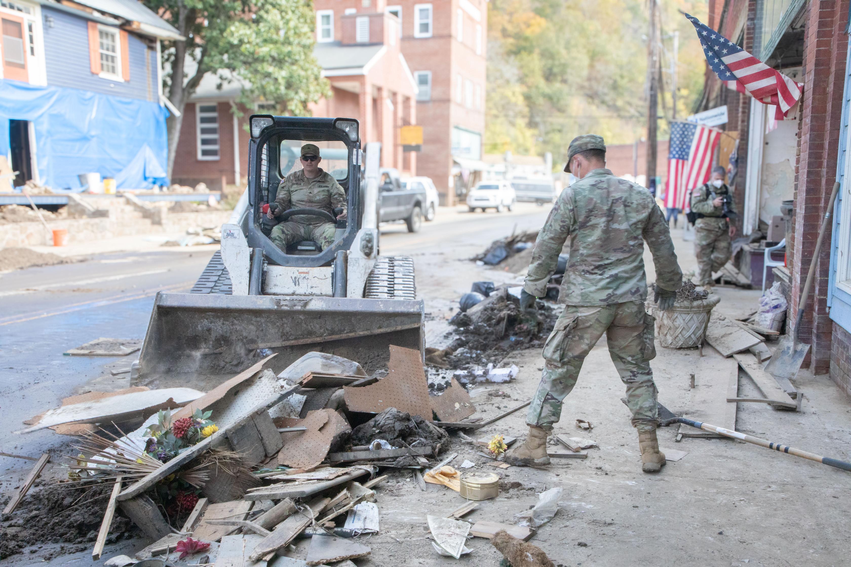 U.S. Army Soldiers with the 30th Armored Brigade Combat Team clear debris in downtown Marshall, North Carolina, Oct. 23, 2024. Joint Task Force- North Carolina deploys military capabilities in support of State authorities in order to protect the lives and properties of fellow Citizens.