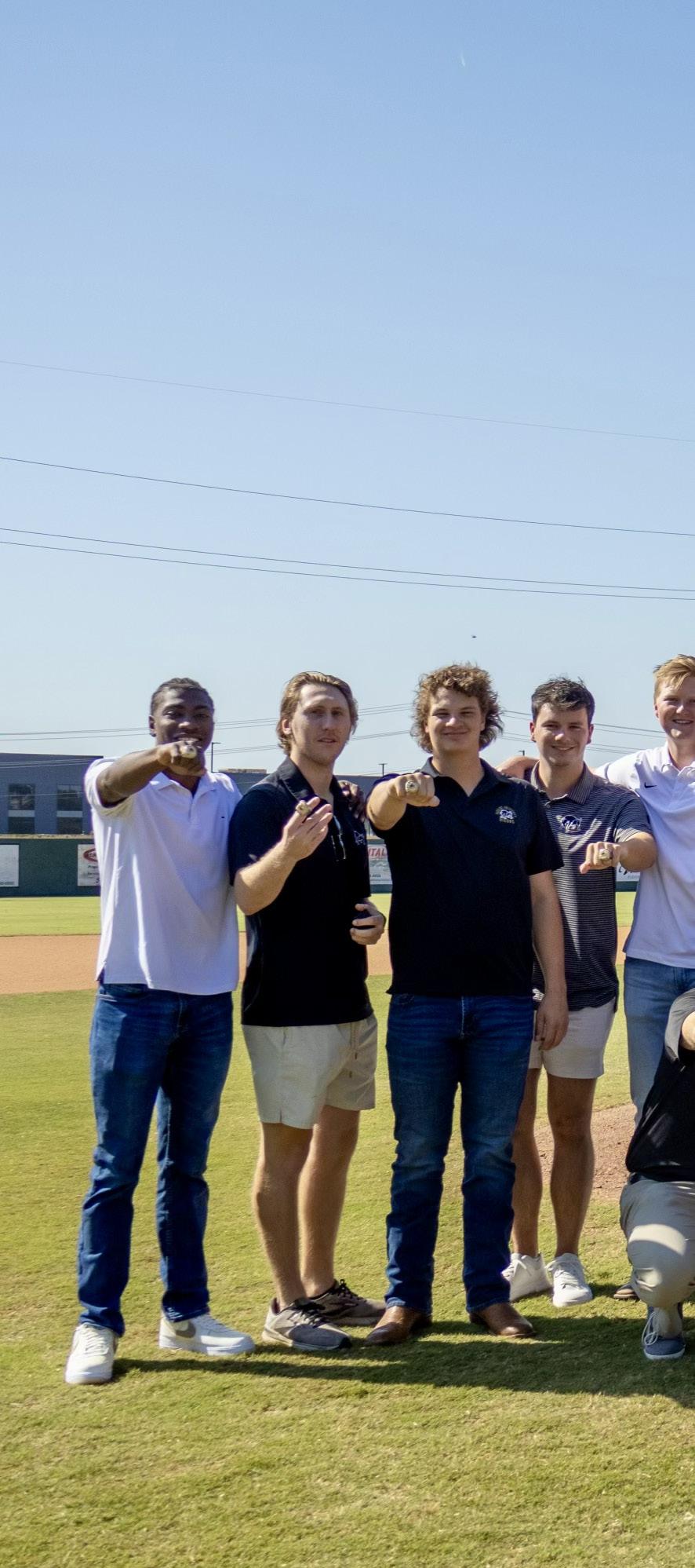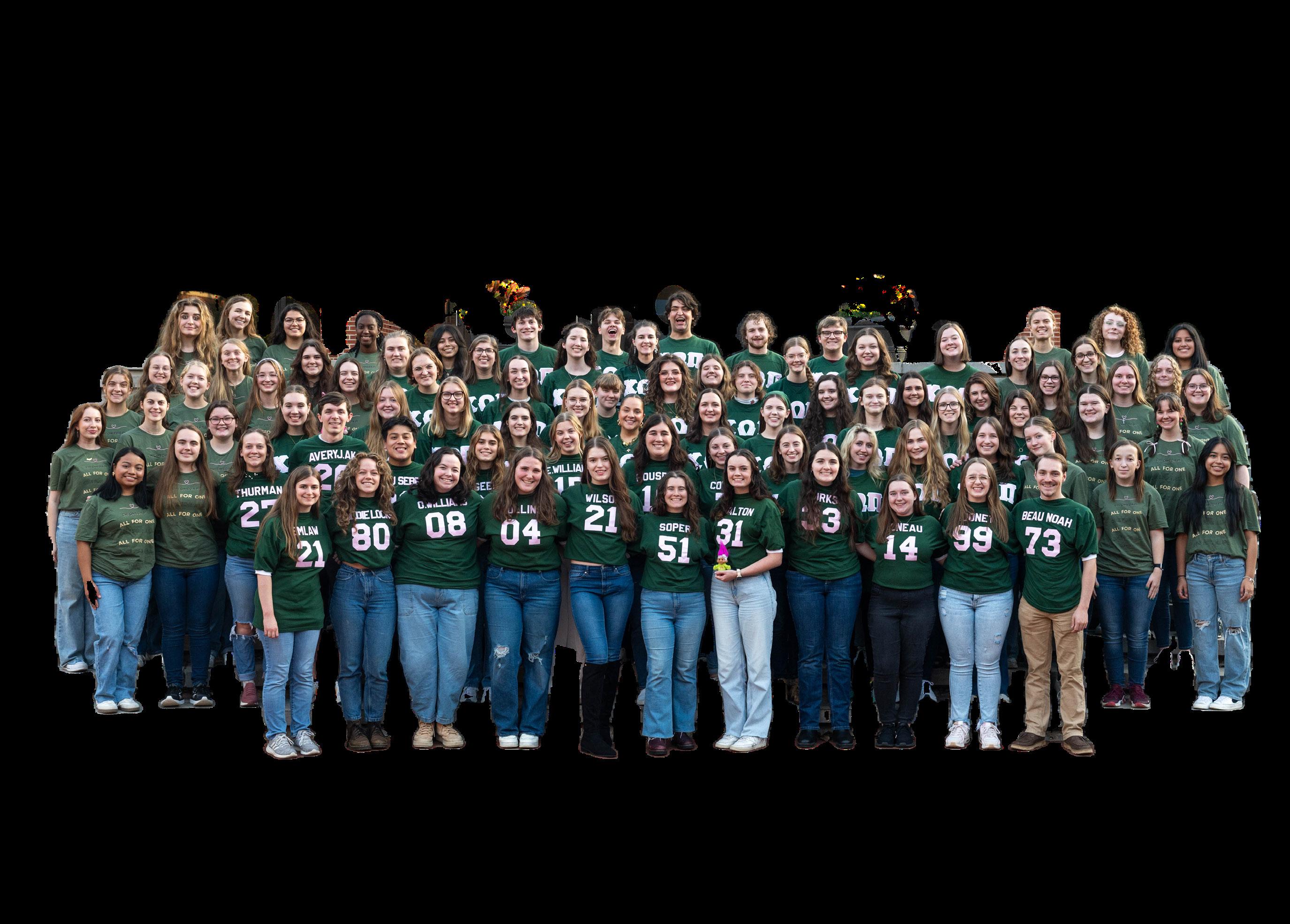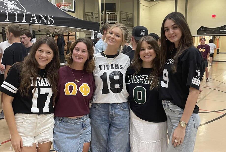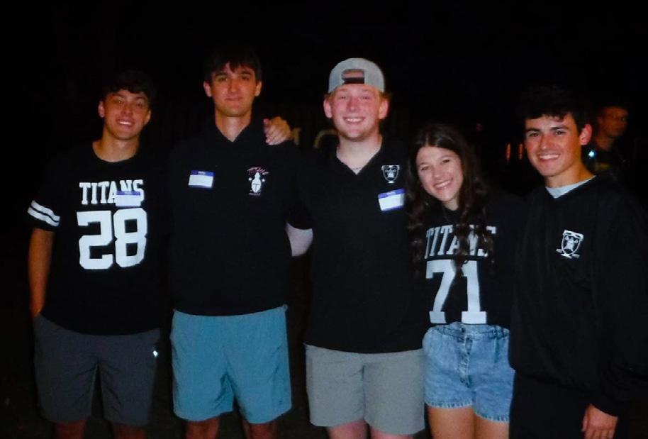 HEADS OF THE HERD Posing on the front lawn, the Stampede first-year guides, juniors Tucker Allen and Macy Phillips and seniors Gray Lusk, James Stone and Susie Green smile for a picture. The increased number of upperclassmen guides compared to years past helped facilitate greater engagement among students.