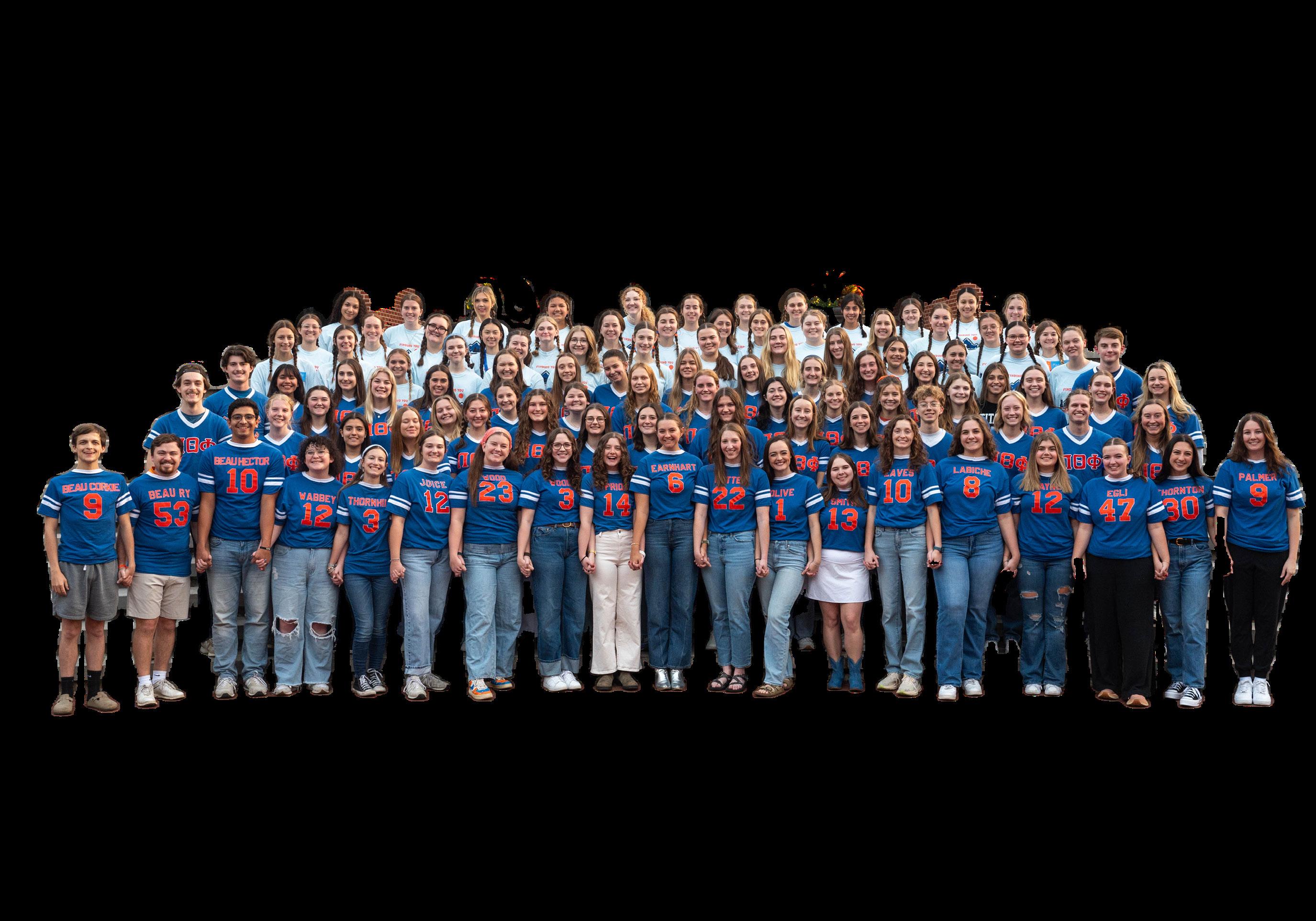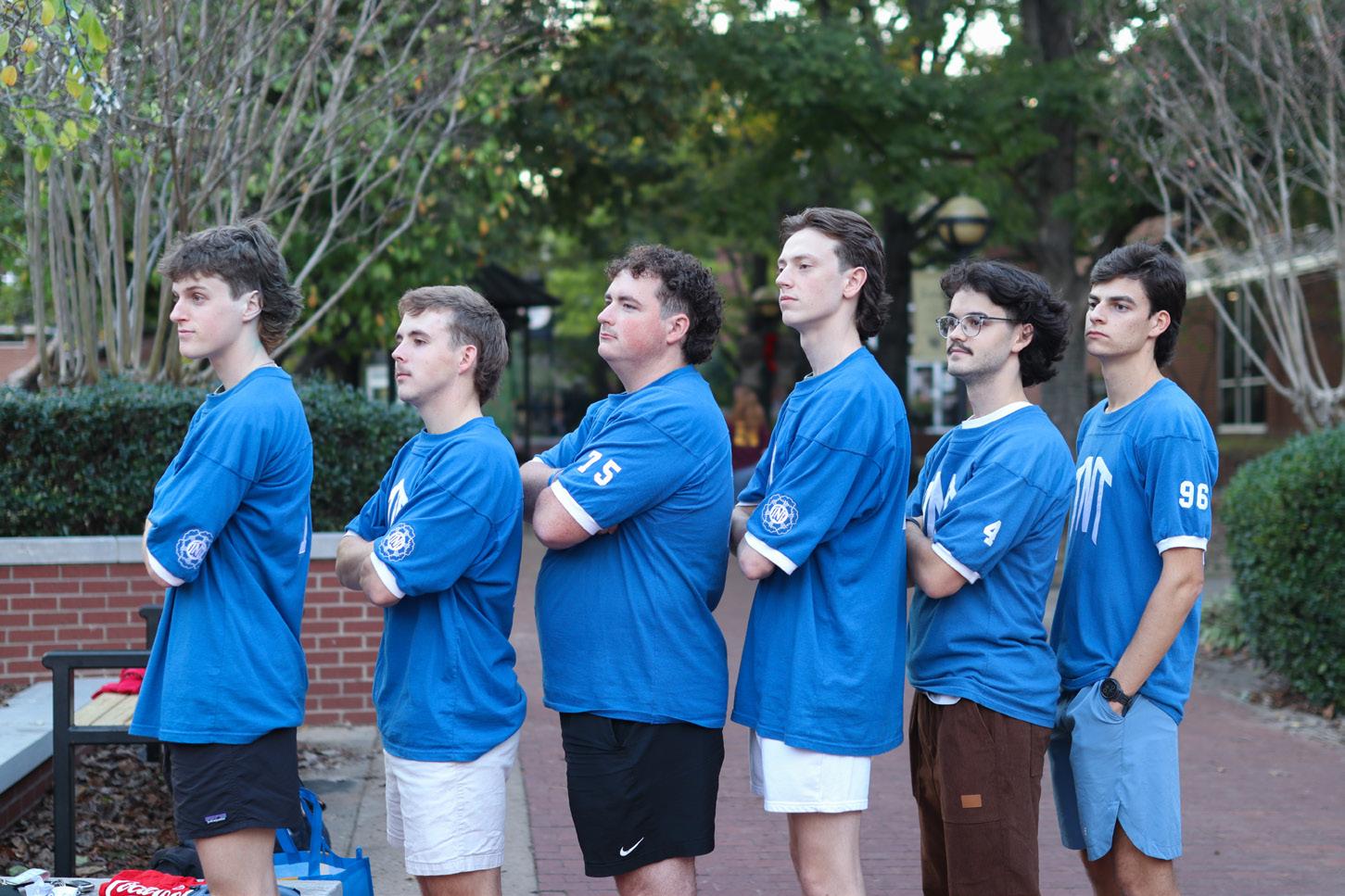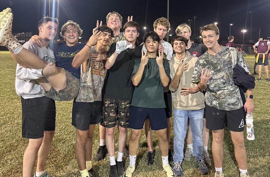 HEADS OF THE HERD Posing on the front lawn, the Stampede first-year guides, juniors Tucker Allen and Macy Phillips and seniors Gray Lusk, James Stone and Susie Green smile for a picture. The increased number of upperclassmen guides compared to years past helped facilitate greater engagement among students.