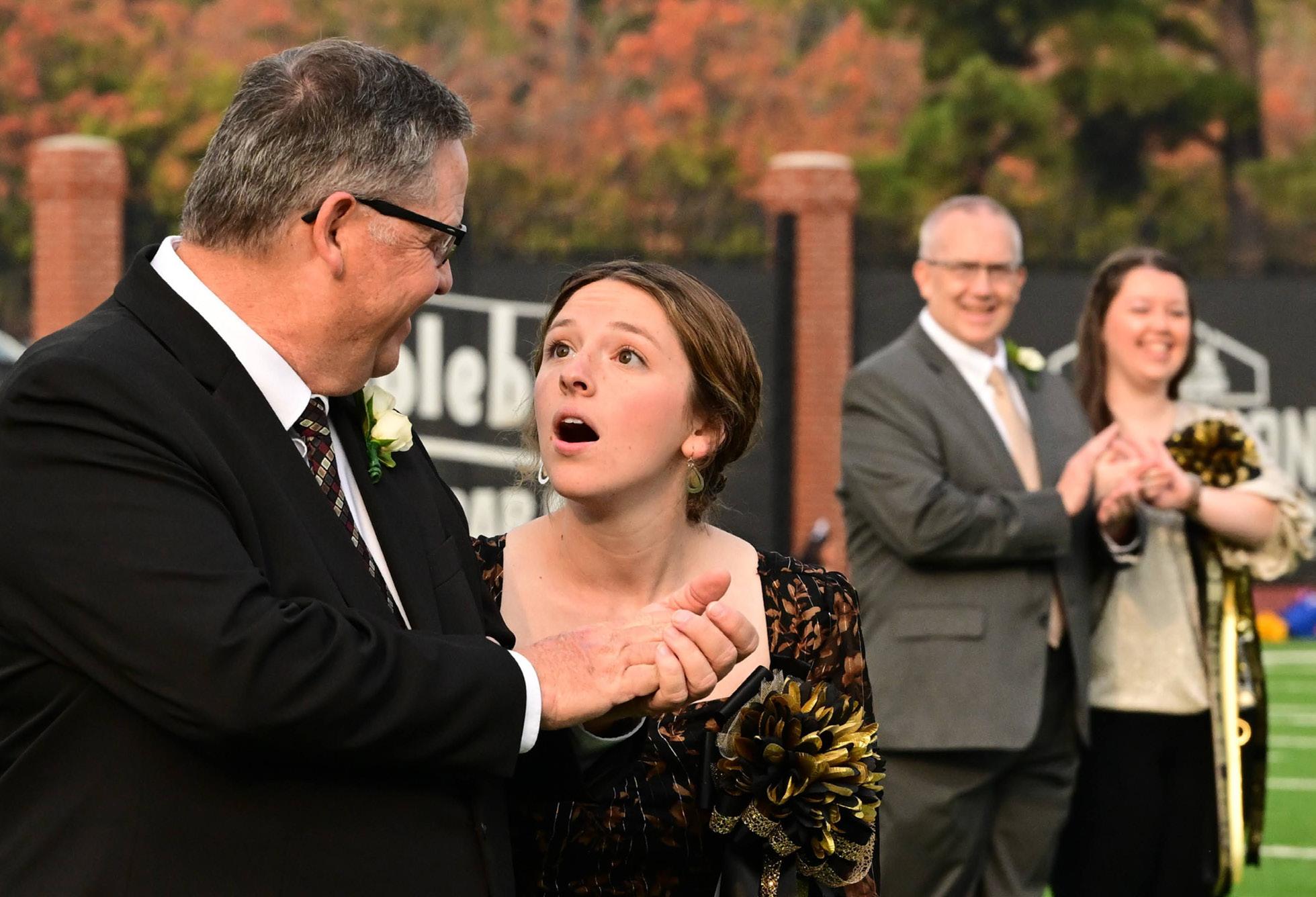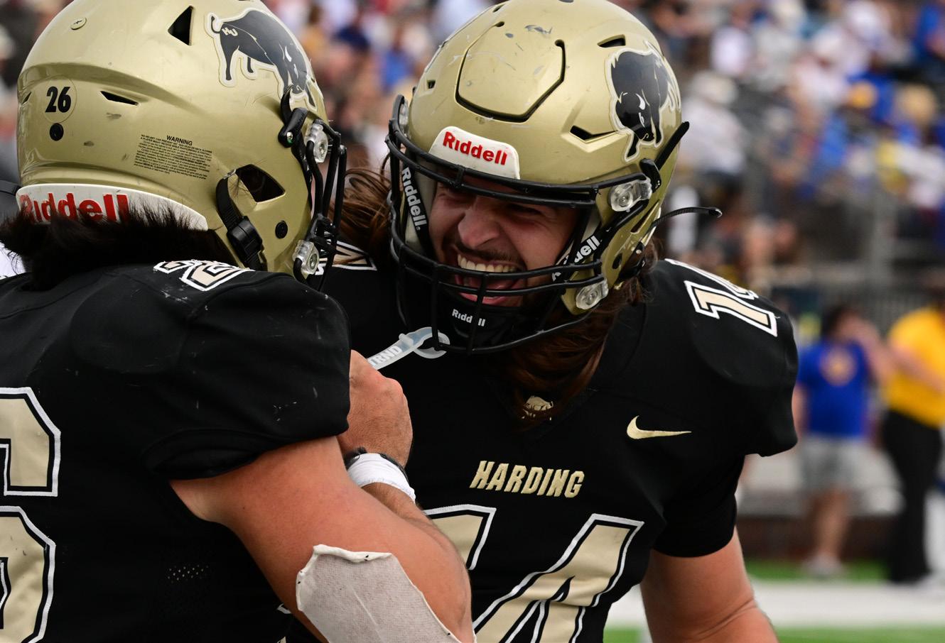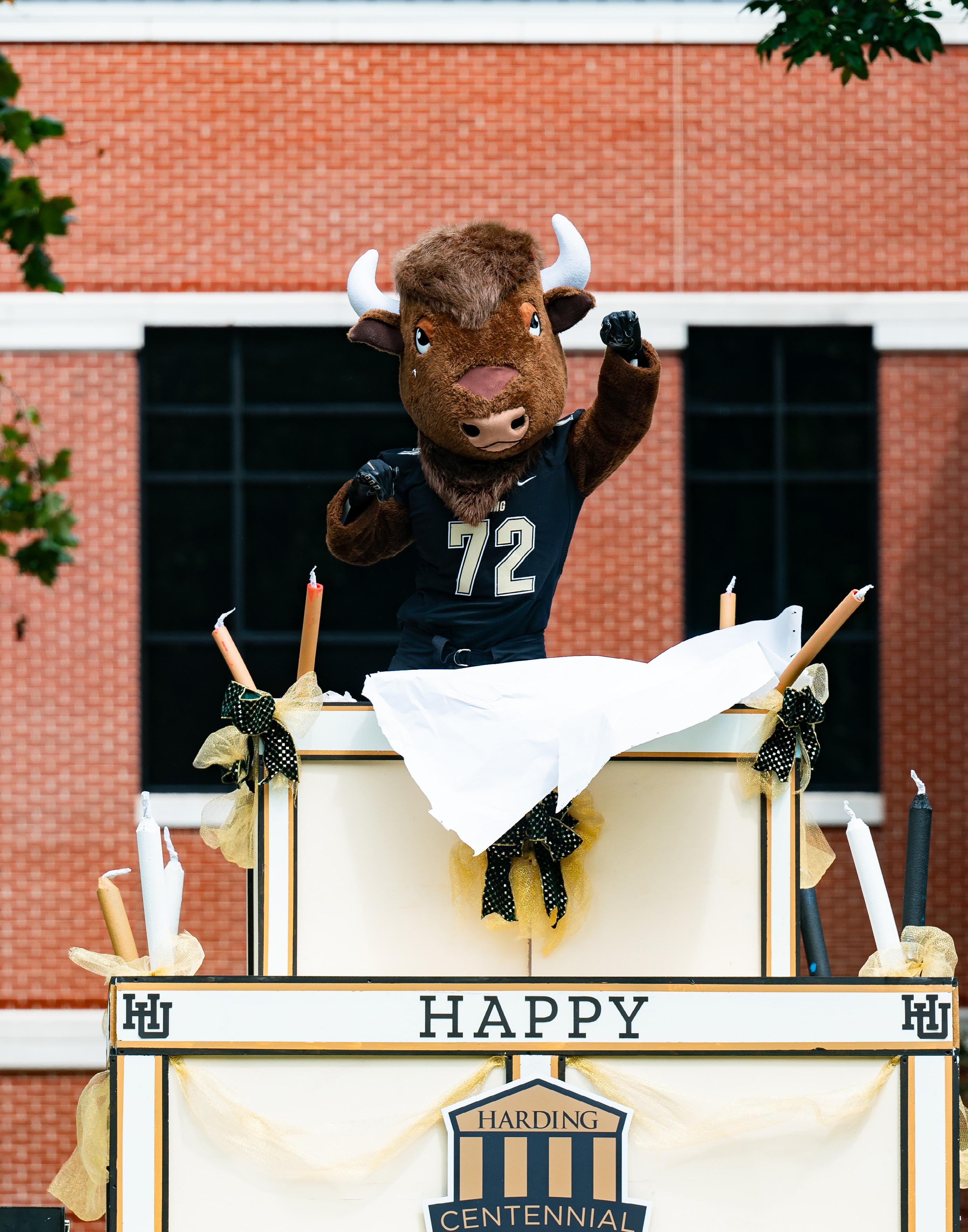 Buff stuffed the mascot costume inside the cake the night before to avoid unwanted attention during the festivities. While the crowd was distracted, he snuck in, climbed a ladder inside the cake and rose from the top at the end of the birthday song. He later made an appearance at the opening football game at First Security Stadium that night. The Harding football team beat Southern Nazarene 59-0 and ended the game with copious amounts of fireworks. The day was a success that both created new memories and reminisced about those from the past with current students and alumni alike.