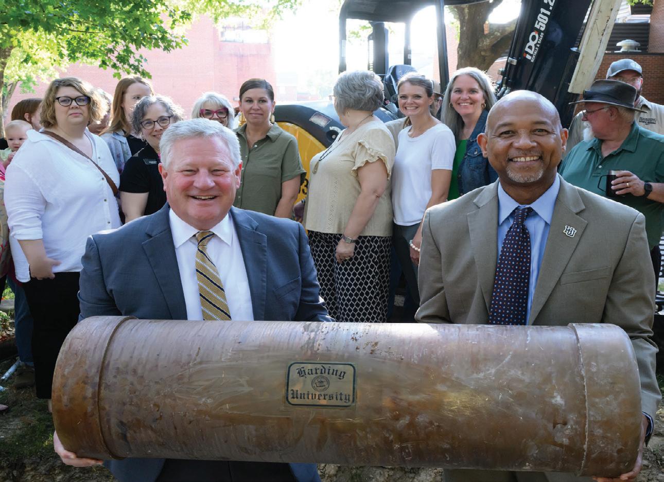 ONE SCOOP AT A TIME On Sept. 5, President Dr. Mike Williams and Vice President Jean-Noel Thompson shovel a ceremonial first scoop on the new time capsule. Students also helped bury Harding mementos in the same location as the 1979 capsule, near the Olen Hendrix building.