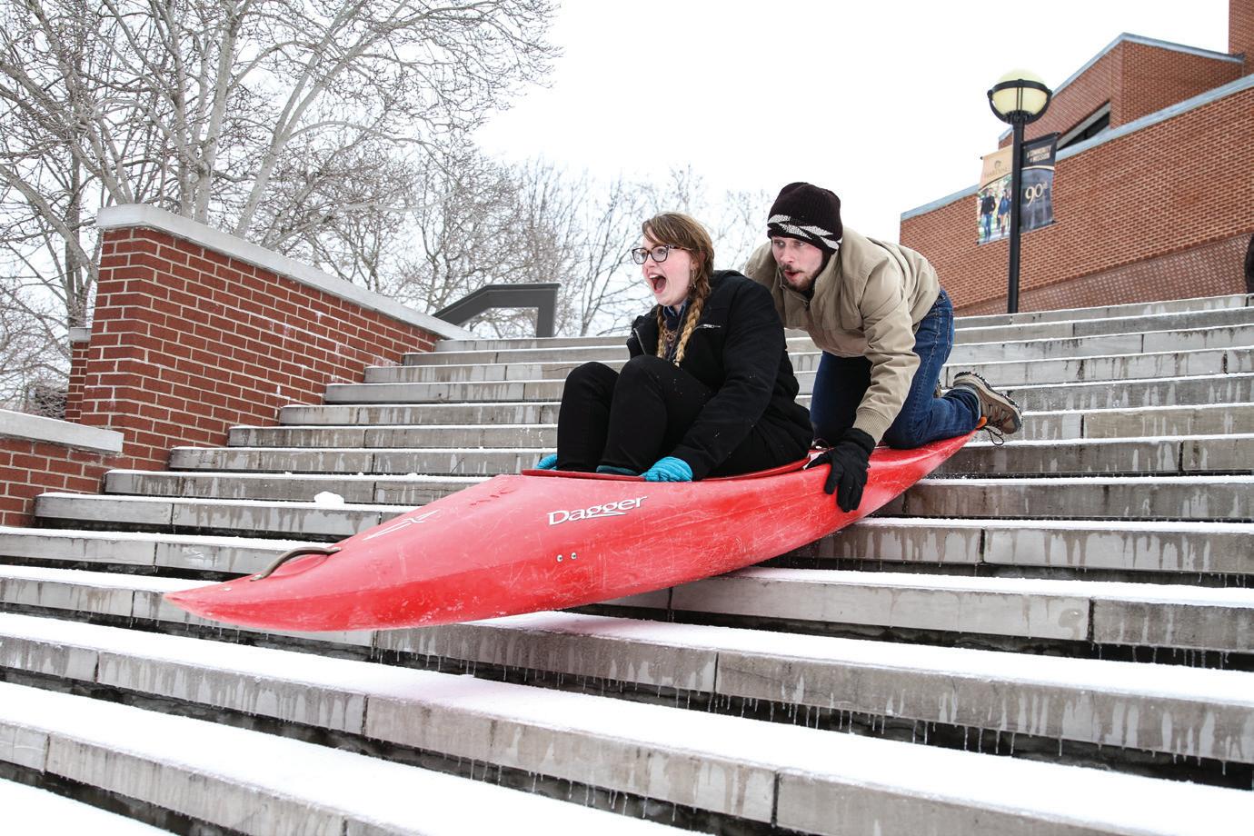 Freshmen Rachel Gibson and Kyle Spillan enjoy the day off of school on Monday, Feb. 16 by kayaking down the Benson steps. On Sunday night, Twitter was flooded with pleas for a snow day, and when it was finally announced, all of campus rejoiced. Here are some of our staff’s favorite tweets from the #icepocalypse.