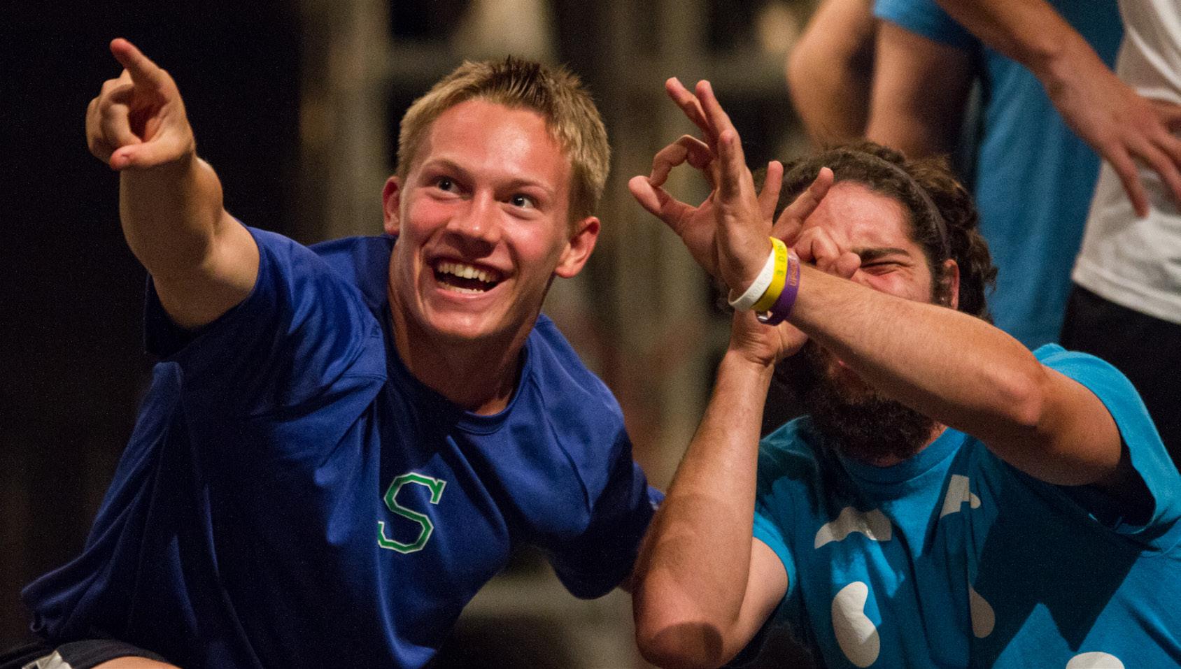 Acting as pirates, freshman Dallas Herrmann and sophomore Caleb Gilmore pantomime peeping through a telescope during a “Pirates!?! A Pillaging of Gilbert and Sullivan” practice on Sunday, Sept. 1. The show premieres as a part of Homecoming week.