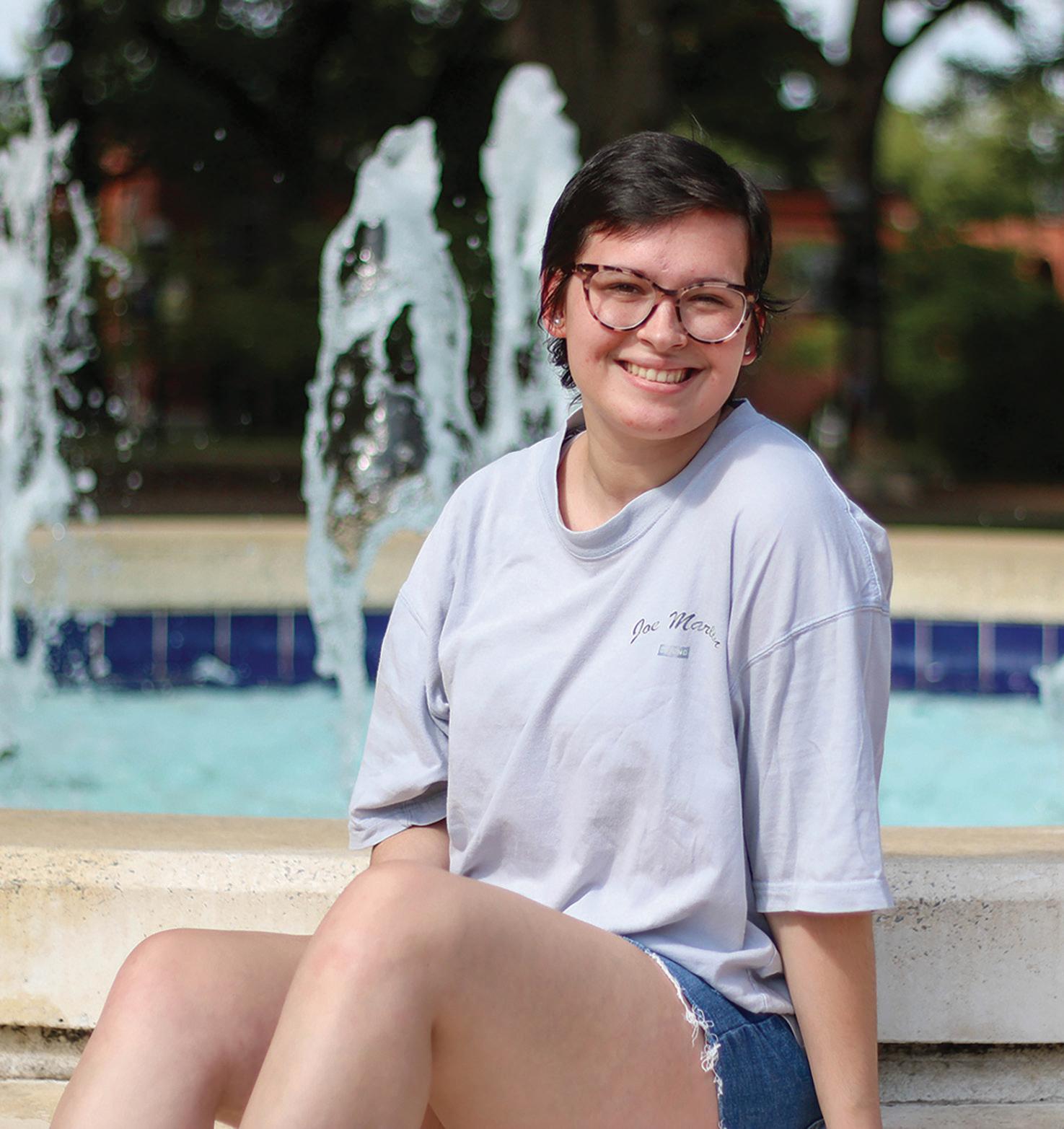 Lynley Eller sits at the fountain outside the Anthony-Wright Administration Building on Sept. 1. Eller returned to campus to resume classes after suffering a traumatic brain injury in a car accident in November 2021.