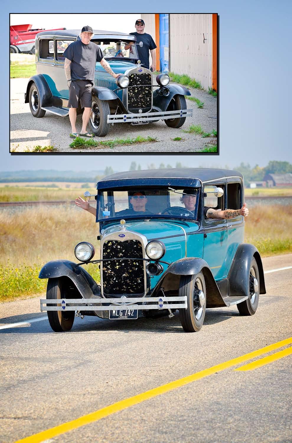 Yankee Model A now a Canadian Model “Eh” ... Kelly McLellan (inset picture, left) and his buddy, Phil Michalowski take a moment to pose in Perdue with the Model A purchased in the United States. McLellan, formerly of Perdue, along with Michalowski, were in the final hours of their six-day trip which started in Des Moines, Iowa. The car ran beautifully although they did have to stop for a few repairs, put out a fire, and plod along at a sedate 80 km/h, as they made their way to the Model A’s new home in Unity. (Independent Photos by Kevin Brautigam)