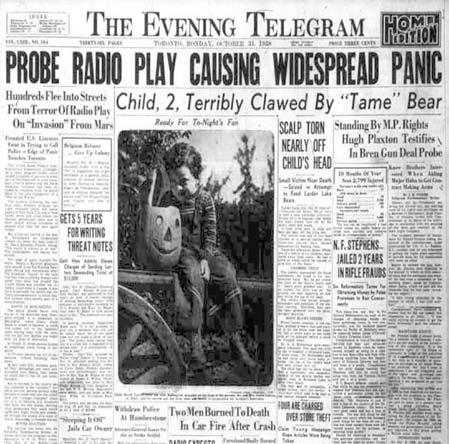 ner that was indistinguishable from news reports of the day in a breaking news style of storytelling. News parodies had been done before, but none to the degree of authenticity as the performance directed by Welles, especially with the dramatic acting, masterful tempo and accompanying sound effects. With Fascism on the rise in Europe and Imperial Japan at War in China, the increasing threat of another global war loomed heavily over daily life. The media was filled with terrifying headlines from overseas with bold headlines utilizing such words as such as “mechanized invasion,” “overwhelming advance,” “fierce resistance” and “mobilization.” The North American population was tense and Welles performance of an alien invasion of the continental United States, presented in the same manner as authentic news broadcast, repeating the same threatening verbiage of the headlines of the day, presented by convincing actors and backed up by unsettling sound effects, played right into the public’s pent up anxiety and fears, briefly touching off a storm. And touch off a storm it did. It is believed that some of the radio audience may have been listening to a program on a rival station and tuned in to The War of the Worlds during a musical interlude (the same as ‘channel flipping’ today during commercials), thereby missing the clear introduction indicating that the show was a work of science fiction. The program tapped into the nation’s collective fear, causing a subconscious emotional response and people believed they were listening to a legitimate news broadcast reporting live on real events. In the United States, police stations across the broadcast network were inundated with panicked phone calls and in some instances, people ran screaming in terror down city streets. Mass hysteria took over and in one case, an ill timed accidental power outage only fuelled the panic. One person in the Midwest allegedly mistook the town’s water tower to be a “Martian War Machine” and blasted several holes into it with a high powered rifle. It is estimated between 1.5 to 2 million listeners across the US had believed the program to be real.