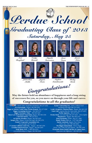 Congratulations to all the graduates! Chuck, Lynn, Jacqueline and family, 306-237-4282 AGI-Envirotank, Biggar, 306-948-5262 Biggar & District Credit Union, Perdue Branch, 306-237-9200 Biggar Accounting Services, 306-948-5133 Biggar Veterinary Clinic, 306-948-3642 Busse Law Professional Corporation, Biggar, 306-948-3346 Cam-Don Motors, 306-237-4212 de Moissac Jewellers, Biggar, 306-948-2452 Integra Tire, Biggar, George and staff, 306-948-3376 Feudal Co-operative Association Ltd., Jim and staff, 306-237-4639 st 1 Avenue Collision Centre Inc., Biggar, 306-948-3356 Grondin Funeral Services, Biggar, 306-948-2669 Kelly Block, M.P., 1-888-590-6555; www.kellyblockmp.ca; Biggar, 306-948-2446.
