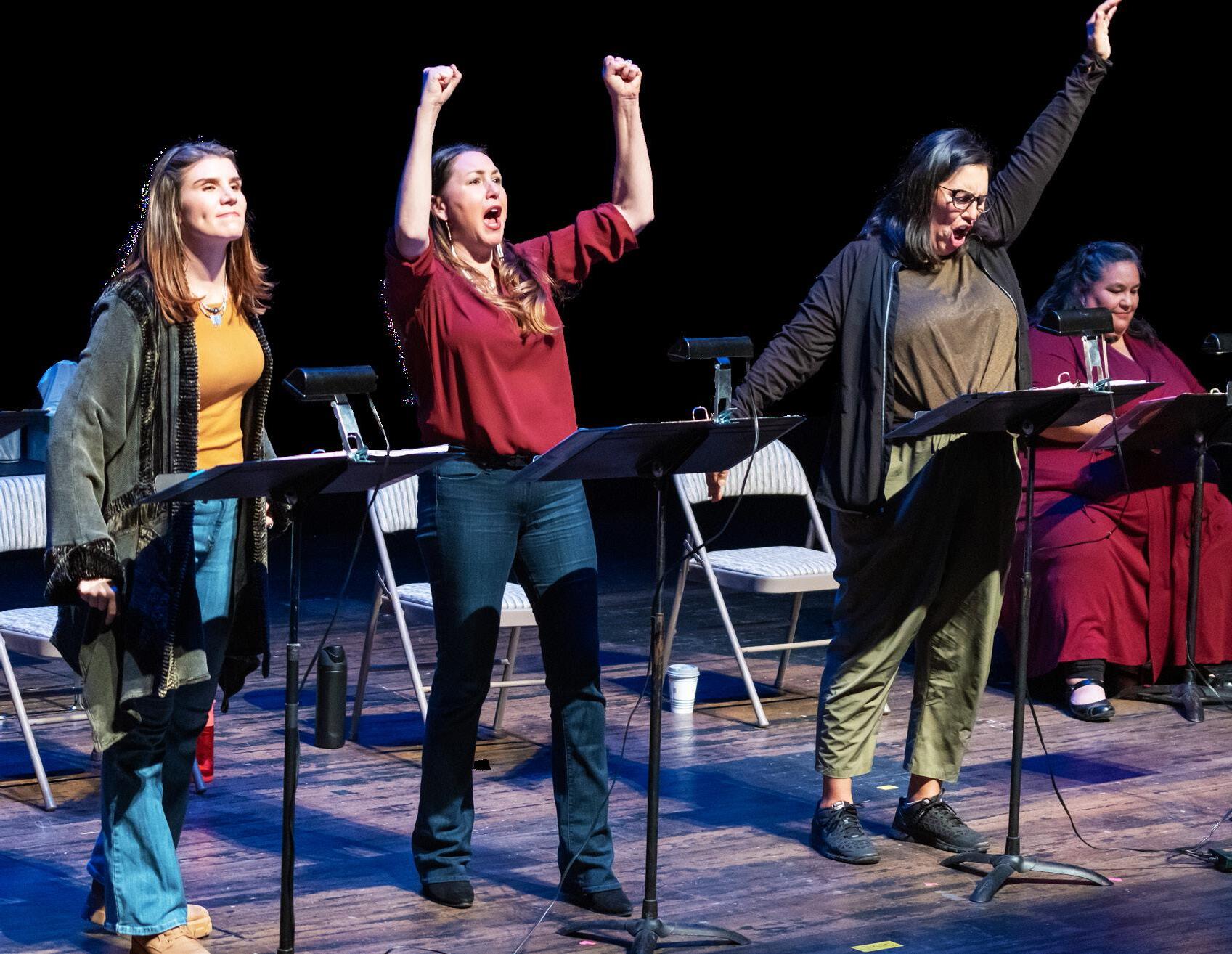 Image: (L-R) Jen Olivares DeLanna Studi, Jennifer Bobiwash, and Jennifer Attocknie in KCRep’s 2023 staged reading of REPRESENTATIVES FOR THOSE AT PEACE. Photo: Don Ipock