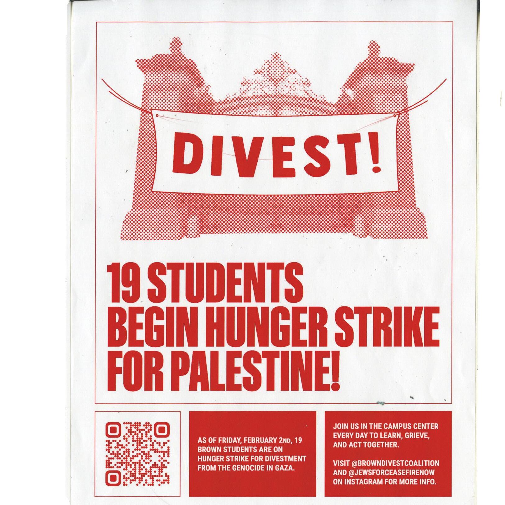 During the week leading up to the Brown University Corporation meetings, 17 undergraduate and graduate students went on a hunger strike from February 2 through February 9. Their demand was that the Corporation listen to protestors and add divestment to the agenda, which the Corporation refused to do. Thus, the students continued their strike until the day of the meetings. During events throughout the week, students, faculty, and alumni leaned on community resiliency through teach-ins, art builds, live music performances, poetry readings, and more.