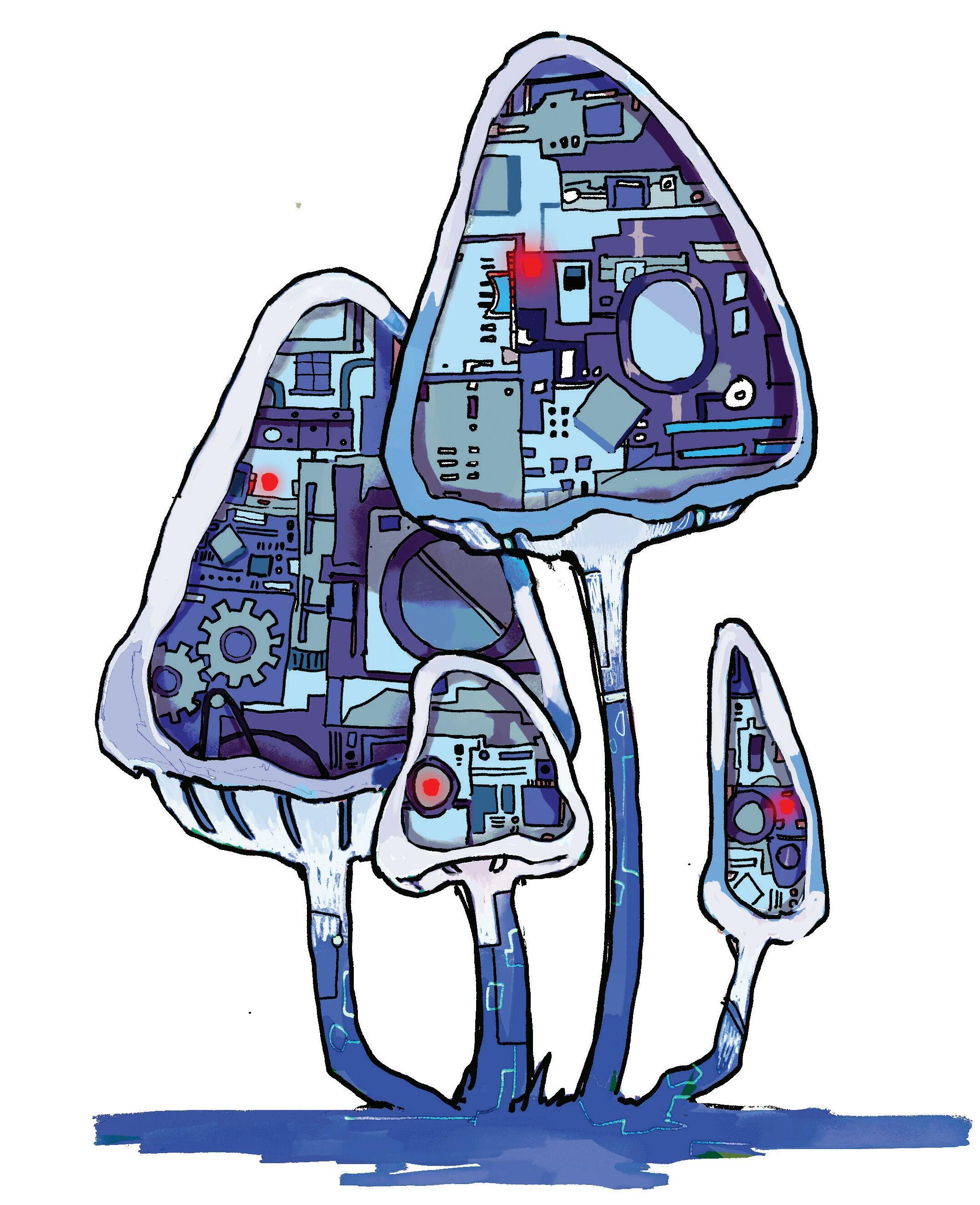 As she walked into the cavern, after filling out a litany of biometric consent and liability forms, she felt that strange prickle on the back of the neck that comes with entering a space that is trying too hard to look natural—the architectural uncanny valley. Then the smell hit her. In the middle of this plaster cave, a pungent powder-white steam seeped out of a giant fluorescent purple mushroom cap and a knotty mix of musk, dank soil, and what seemed to be a kale-sandalwood infusion hung in the air. Scattered around the dripping grotto walls, dozens of couples, trios, groups too entwined to individuate, and an occasional bashful solo traveler, all grinded against plant-themed sex toys, the giant central spore, and each other. She walked up to a particularly alluring root and gave it a squeeze, recoiling slightly at the bipartite construction, a spongy spray-painted layer giving way to a solid, smooth plastic interior.