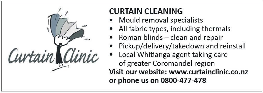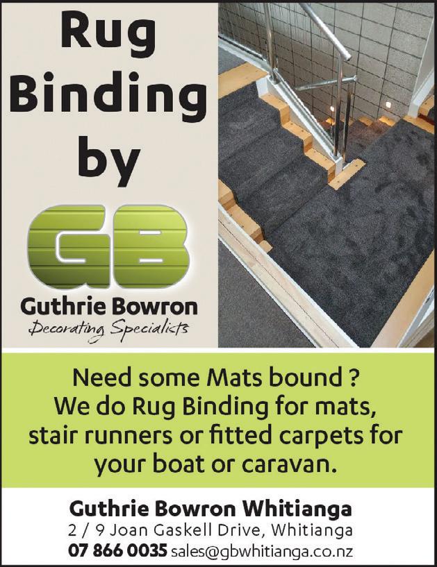 32 | The Coromandel Informer – 7 May 2024 www.theinformer.co.nz Inspiration starts here, at your local Guthrie Bowron Whitianga. 2/9 Joan Gaskell Drive, Whitianga 07 866 0035 curtains@gbwhitianga.co.nz www.facebook.com/gbwhitianga Plus, a free in-home measure and quote! # Free ON THOUSANDS OF FABRICS CURTAIN MAKING* 15 SELECTED BLINDS, SHUTTERS AND MOTORISATION^ *Applies to lined curtains only using selected fabrics over $69 99 per metre when width is under 150cm or $79 99 and over per metre for wide width or continuous fabrics Minimum drop of 160cm and maximum height o 250cm. Excludes Roman Blinds Eyelet Curtains and componentry ^ Selected styles and brands only. Please see in-store for details. Orders must be confirmed by 4th June 2024 to be eligible for this offer Not available in conjunction with any other offer #Travel distance parameters may app y Curtains image: Baroda Kingfisher from Maurice Kain. Blinds image: Duette® Shades from Luxaflex® Right now at Guthrie Bowron, get FREE curtain making* on thousands of fabrics, and 15% off selected blinds, shutters and motorisation ! Plus, ge t a free in-home measure and quote #! Orders must be in by 4th June 2024 so pop in store and have a chat to our knowledgeable team about your window furnishings OUR LEGAL SERVICES INCLUDE: PROPERTY - COMMERCIAL - FAMILY COMMON LAW - PERSONAL - FINANCING TRUSTS - ASSET PROTECTION - NOTARY PUBLIC WHAT WE OFFER: • Long tradition of trusted performance and reliability • Quality of service and practical advice • Promptness and efficiency • Reasonable fees and regular reporting 14 Monk St, Whitianga 3510 www.renniecox.co.nz whitianga@renniecox.co.nz 0800RENNIECOX (0800 736 643) Total Mobility is here .... Register now Save up to 75% on taxi fares*